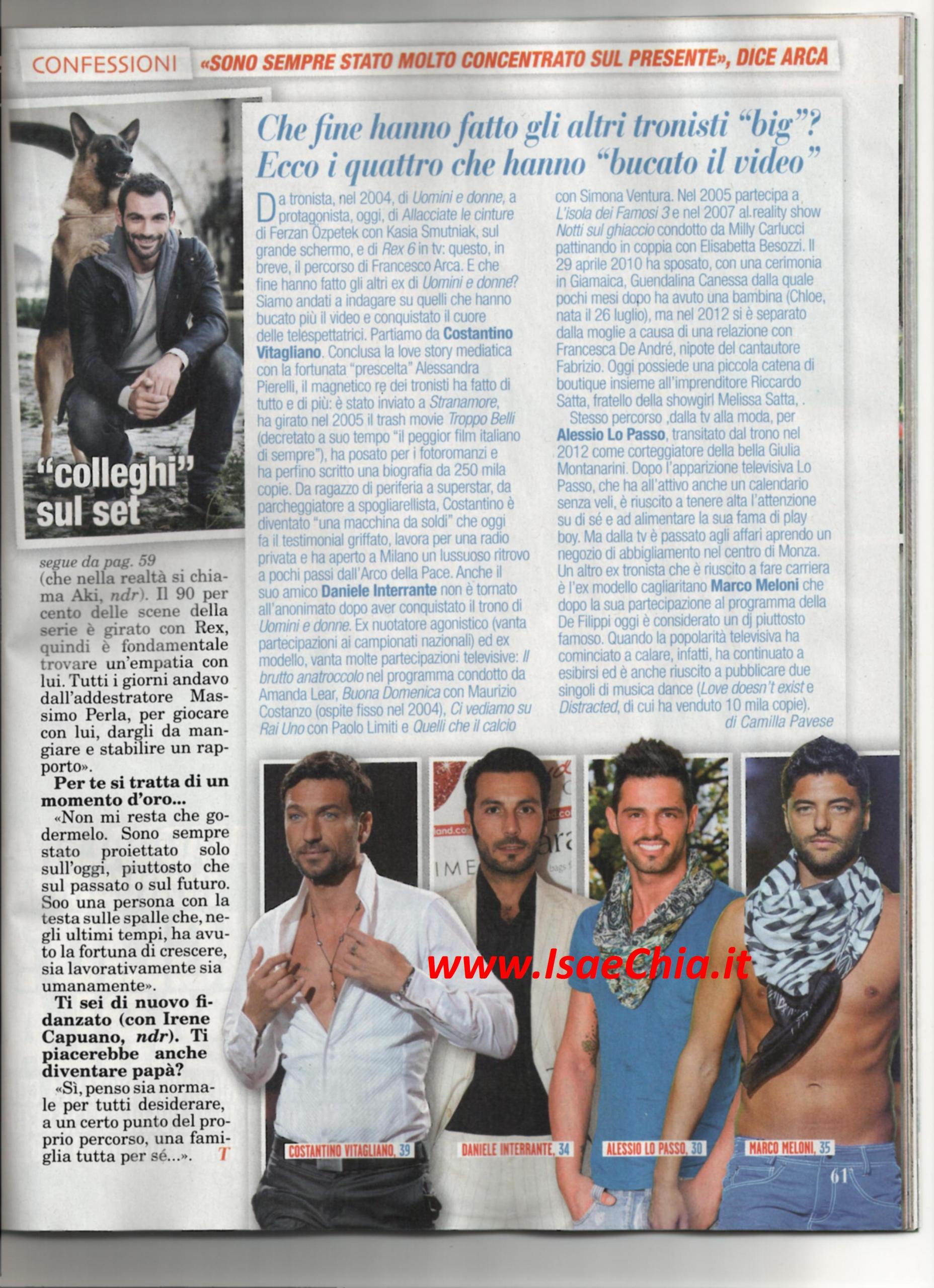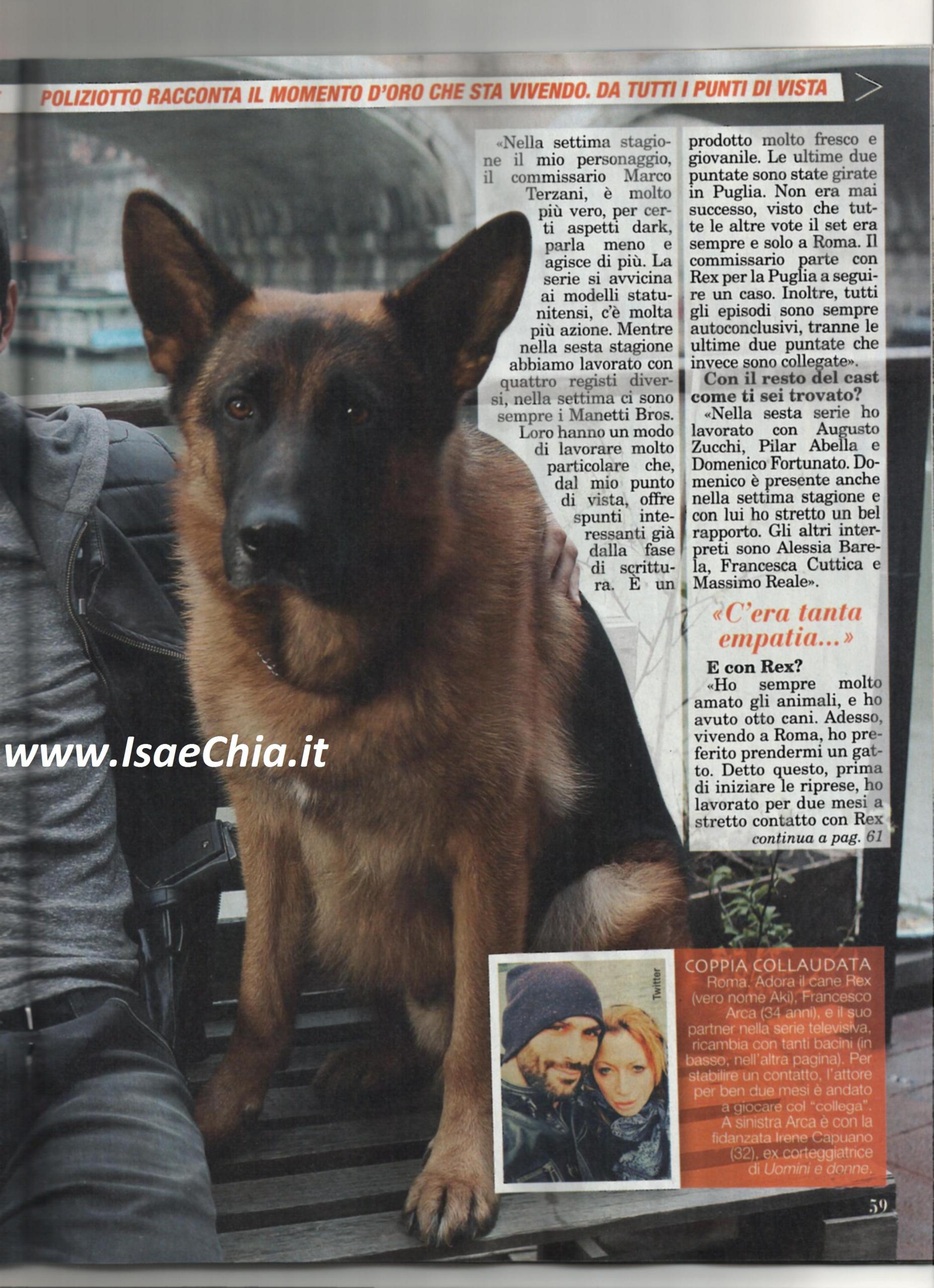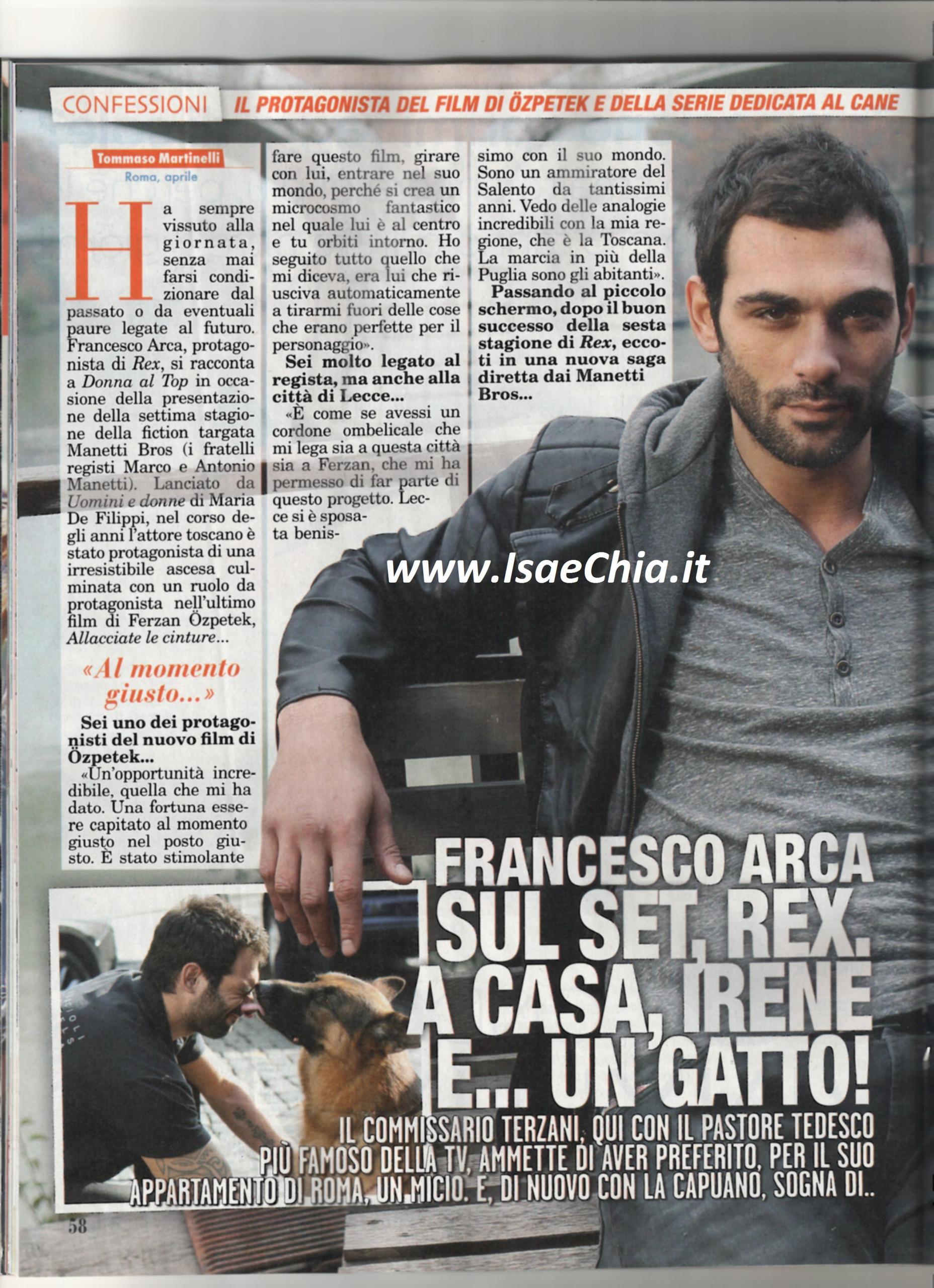 Per l’ex tronista Francesco Arca è davvero un periodo d’oro: “Ho preso parte al film Allacciate le cinture, di Ferzan Ozpetek. Mi è capitata un’opportunità incredibile. Una fortuna esser capitato al momento giusto nel posto giusto. Lui crea un microcosmo, finché tu gli orbiti intorno. Ho seguito tutto quello che mi diceva e lui riusciva automaticamente a tirarmi fuori cose che erano adatte al personaggio. La città di Lecce si è sposata benissimo a questo progetto. Sono un ammiratore del Salento da molti anni: vedo delle analogie con la mia Toscana. In tv, invece, sono nella settima serie di Il commissario Rex. Il mio personaggio, Marco Terzani, è molto più vero, per certi aspetti dark, parla meno e agisce di più. La serie si avvicina a quelle americane, c’è più azione. Il modo di lavorare dei Manetti Bros. offre spunti interessanti già dalla fase di scrittura. Ho sempre amato i cani e ne ho avuti otto. Adesso, però, vivendo a Roma, ho preferito prendermi un gatto. Prima delle riprese, ho lavorato a stretto contatto con Aki, il cane che nella fiction è Rex: è stato fondamentale trovare l’empatia con lui”. Infine, quando gli si fa notare il suo periodo d’oro e gli si chiede del ritorno di fiamma con Irene Capuano, risponde: “Sono una persona con la testa sulle spalle che nell’ultimo periodo ha avuto modo di crescere, professionalmente e umanamente. Ad un certo punto, credo sia normale per tutti desiderare una famiglia tutta per sé…”