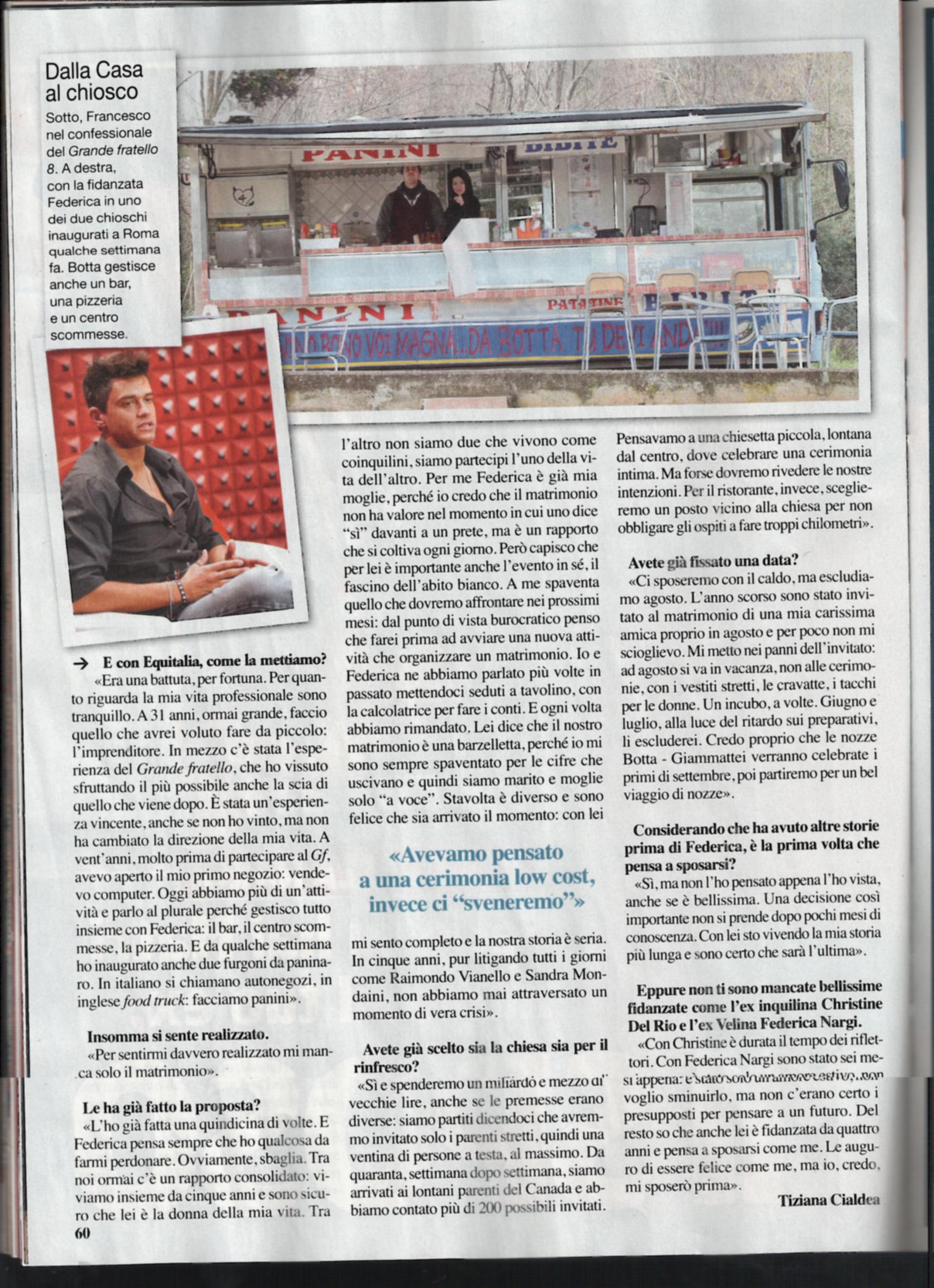 L’ex concorrente del Grande fratello 8 Francesco Botta annuncia il suo matrimonio imminente: “La proposta a Federica l’ho fatta già una quindicina di volte e lei pensa che è perché ho qualcosa da farmi perdonare! Invece il nostro è un rapporto consolidato: conviviamo da cinque anni. Per me lei è già mia moglie perché io credo che il matrimonio non ha valore dal momento in cui dice uno dice “sì” davanti a un prete, ma è un rapporto che si coltiva ogni giorno. Ne abbiamo parlato più volte e fatto i conti a tavolino, ma poi abbiamo rimandato, lei dice che il nostro matrimonio è una barzelletta. Questa volta però è quella giusta. Spenderemo un miliardo e mezzo delle vecchie lire, nonostante fossimo partiti dall’idea di invitare solo i parenti stretti. Siamo finiti a quasi 200 possibili invitati. Ci sposeremo con il caldo, ma escludo agosto, che è fatto per le vacanze, non per stare in cravatta alle cerimonie! E’ la prima volta che penso a sposarmi, ma non l’ho pensato la prima volta che l’ho vista, nonostante sia bellissima. Con lei sto vivendo la mia storia più lunga e so che sarà anche l’ultima”. Quando gli si chiede delle sue bellissime ex, la sua ex coinquilina Christine del Rio e l’ex Velina Federica Nargi, risponde: “Con Christine è durata il tempo dei riflettori. Con la Nargi sono stato sei mesi appena, è stato un amore estivo, senza sminuirlo, ma non c’erano i presupposti per un matrimonio!”