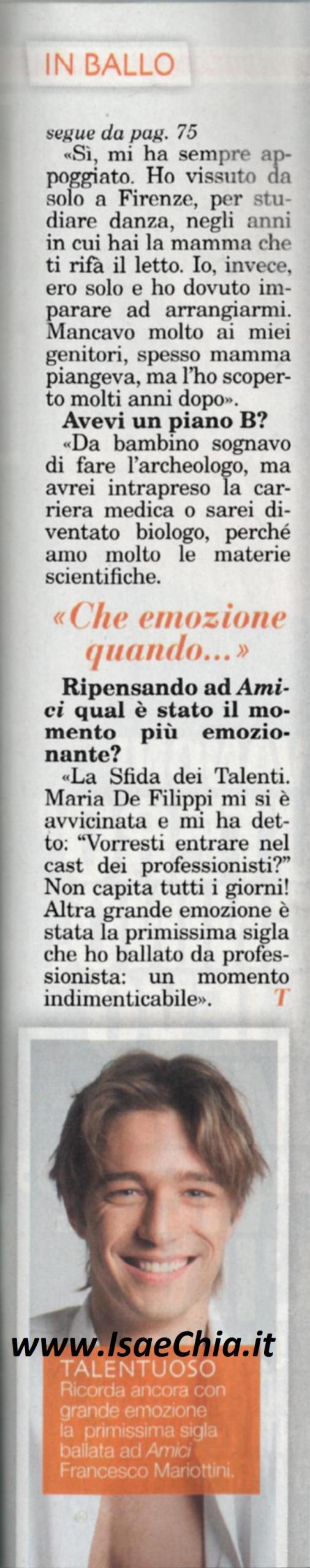 L’ex ballerino di Amici Francesco Mariottini è stato testimonial d’eccezione del Winx Fairy Dance, un progetto dedicato alle ballerine del domani: “Vedere bambine che amano il mondo delle Winx, le fatine del cartone animato, e allo stesso tempo il mondo della danza, con gli occhi che s’illuminano di passione è un’emozione unica. L’idea del Winx Fairy Dance, realizzando dei corsi di danza, è di avvicinare le ragazzine al mondo della danza e ai suoi valori, grazie alle fatine ambasciatrici di messaggi d’energia e amicizia. Molti bambini passano molte ore davanti al computer tra videogiochi e social, scordando che fuori c’è un mondo da conoscere. Si appassionano delle foto in Rete, anziché fare una partita di pallone. Nelle scuole di danza, molti bambini si stancano dopo un’ora di lezione, mentre io a 11 anni ne facevo tre ed ero ancora carico a mille. A 14 anni, quando studiavo a Firenze, ero a lezione dalle 14 alle 21 e col tempo le ore sono aumentate. Oggi pochi farebbero una scelta del genere. I miei mi hanno sempre appoggiato e ho vissuto da solo a Firenze per studiare danza, negli anni in cui la mamma ti rifà il letto. Solo dopo ho scoperto che mia mamma spesso piangeva e che mancavo molto ai miei. Avevo un piano B: da bambino sognavo di fare l’archeologo, ma credo che avrei intrapreso la carriera medica o avrei fatto il biologo, perché amo le materie scientifiche. I momenti più emozionanti di Amici? Quando in occasione della sfida tra i talenti, Maria De Filippi mi ha richiamato tra i ballerini professionisti. E poi quando ho ballato la prima sigla da professionista: un momento indimenticabile”.