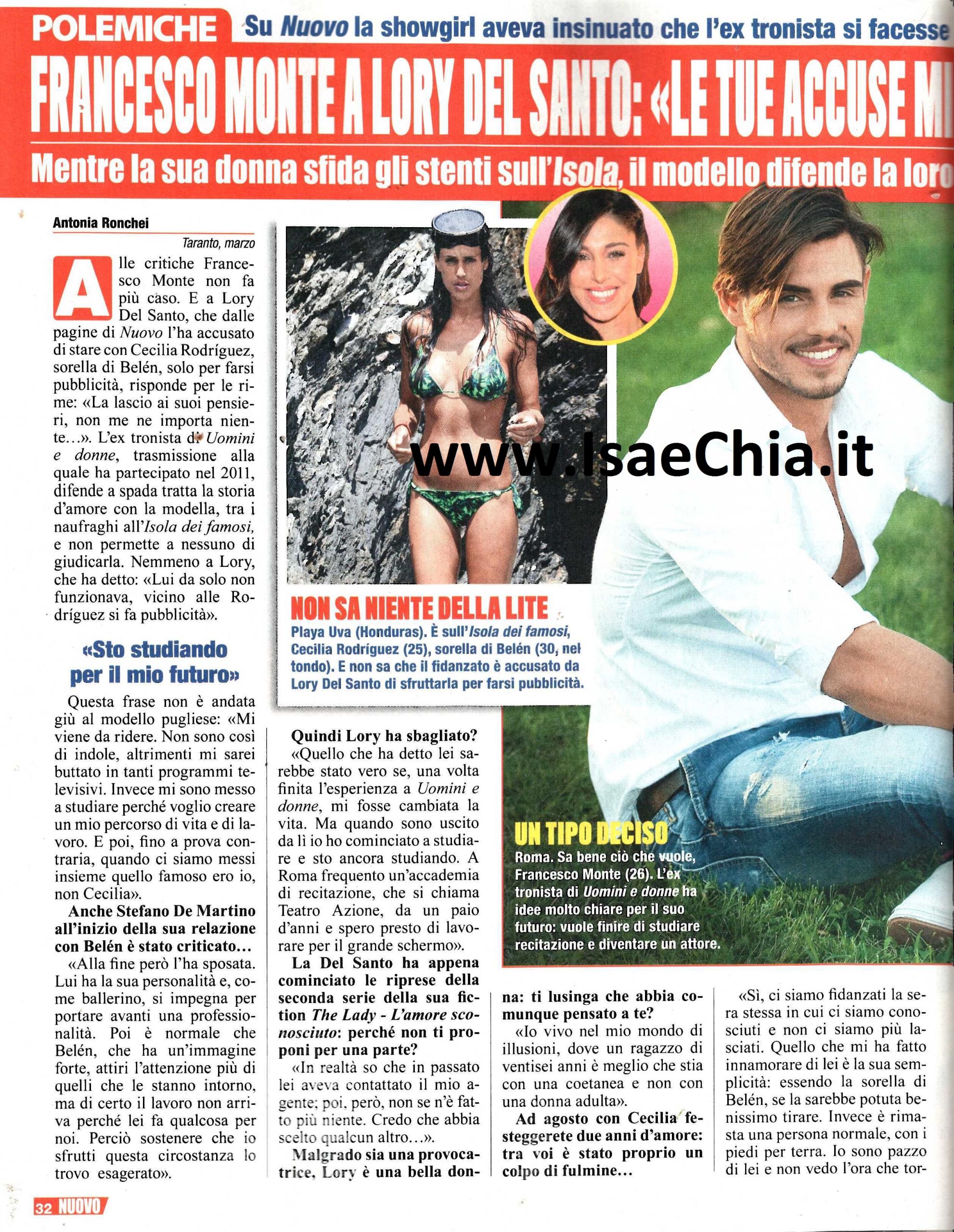 Negli scorsi giorni Lory Del Santo, ex showgirl e oggi produttrice e regista, ha accusato l’ex tronista Francesco Monte di stare con Cecilia Rodriguez e di presenziare in studio all’Isola dei famosi, di cui lei è finalista, solo a scopo di visibilità: “Lui da solo non funzionava. Vicino alle Rodriguez si fa pubblicità” sono state le sue parole. Ma il bel pugliese non ci sta e nonostante sia abituato ad essere esposto a critiche, risponde: “Mi viene da ridere. Non sono così di indole, altrimenti mi sarei buttato in tanti altri programmi televisivi, invece mi sono messo a studiare perché voglio creare un mio percorso di vita e di lavoro. E poi, fino a prova contraria, quando ci siamo messi insieme, quello famoso ero io, non Cecilia!“. Quando gli si fa notare che all’inizio anche Stefano De Martino, ballerino ad Amici, era stato criticato per la sua relazione con Belén Rodriguez, sorella di Cecilia, Francesco commenta: “Sì, ma poi l’ha sposata. Lui ha la sua personalità e si impegna per portare avanti una professionalità. Poi è normale che Belén, che ha un’immagine forte, attiri l’attenzione più di quelli che stanno intorno, ma di certo il lavoro non arrivava perché lei fa qualcosa per noi. Perciò sostenere che io sfrutti questa circostanza lo trovo esagerato. Quello che ha detto Lory sarebbe stato vero se, una volta finita l’esperienza a Uomini e Donne, mi fosse cambiata la vita. Ma da quando sono uscito, ho cominciato a studiare e lo sto ancora facendo. A Roma frequento una scuola di recitazione da un paio d’anni e spero di lavorare per il grande schermo. In realtà so che la Del Santo in passato aveva contattato il mio agente, poi, però, non si è fatto più niente. Credo che abbia scelto qualcun altro“. E quando gli si fa notare che è una bella donna e una provocatrice e gli si chiede se lo lusinga il fatto che l’abbia cercato, Francesco risponde: “Io vivo nel mio mondo di illusioni, dove un ragazzo di 26 anni è meglio che stia con una coetanea e non con una donna adulta. Io e Cecilia ci siamo fidanzati la sera stessa in cui ci siamo conosciuti. Quello che mi ha fatto innamorare è stata la sua semplicità: essendo la sorella di Belén, se la sarebbe potuta benissimo tirare. Invece è rimasta una persona normale, con i piedi per terra. Io sono pazzo di lei e non vedo l’ora che torni. Sto malissimo, sono due mesi che non la vedo! Queste sono esperienze che o uccidono o fortificano la coppia. Capisco che la situazione sia difficile per lei lì, ma lo è anche qui: in tv vediamo solo quello che vogliono farci vedere, posso vedere solo cinque minuti di video e non so cosa accade durante tutta la giornata“. Quando gli si fa notare che al ritorno dall’Isola, qualche anno fa, Belén si lasciò col fidanzato di allora, il calciatore Marco Borriello a causa del presunto flirt di Belén con Rossano Rubicondi, Monte risponde: “Quando partecipi ad un reality, dimentichi un po’ cosa c’è fuori e secondo me, Marco ha fatto l’errore di valutare la loro storia sulla base di ciò che vedeva. Io forse la vivo peggio, perché forse so che cosa possono fare gli addetti ai lavori per movimentare il gioco. Fortunatamente con Cecilia sembra tutto tranquillo: sono solo ansioso perché vorrei vederla e mi sono stancato. Quando tornerà, ci organizzeremo per vederci, come facevamo prima, visto che mi sono trasferito a Roma. Di certo non ci lasceremo!“. Chiedendogli se si sente pronto a metter su famiglia, risponde: “Con la società di oggi non ci sono più i ragazzi di vent’anni che pensano a sposarsi e avere figli: le difficoltà per entrare nel mondo del lavoro sono notevoli e se hai un lavoro precario come il mio, avere un figlio non è una responsabilità da poco. Mi cercano ancora per le serate ma sto cercando di iniziare una carriera come attore. Purtroppo, mi sbarrano le strade dappertutto quando sentono che sono stato tronista. Aver partecipato alla trasmissione di Maria De Filippi mi ha dato tanta visibilità, però in alcune situazioni è stato anche un limite“.