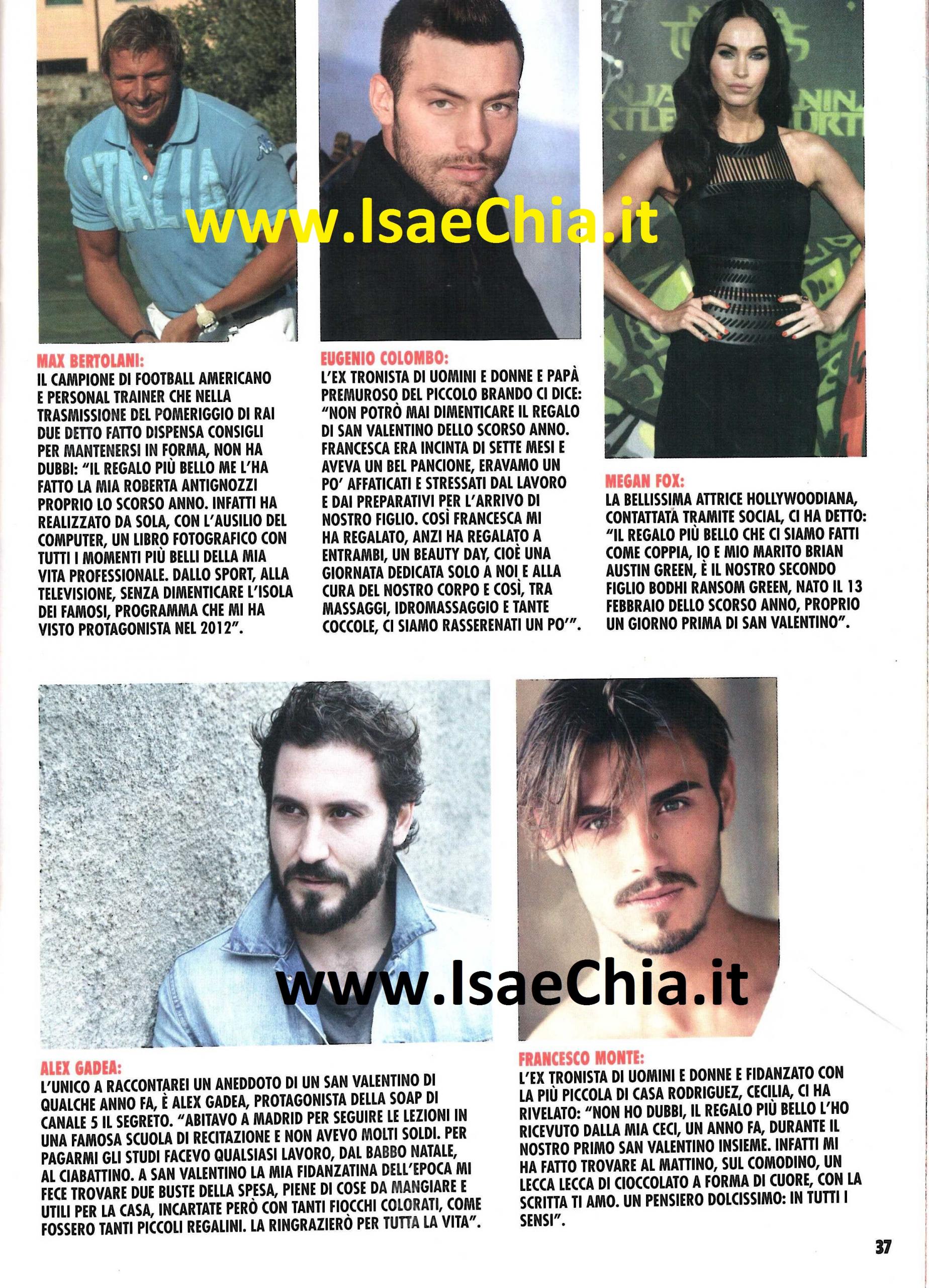 In occasione della festa di San Valentino, il settimanale Vip ha intervistato alcuni volti del mondo dello spettacolo, chiedendo loro del regalo più bello ricevuto per la festa degli innamorati. “Non potrò mai dimenticare il regalo dello scorso anno” dice Eugenio Colombo, che ha conosciuto la sua Francesca Del Taglia a Uomini e Donne e da lei ha avuto il piccolo Brando. “Francesca era incinta di sette mesi e aveva un bel pancione, eravamo un po’ affaticati dallo stress del lavoro e dai preparativi per l’arrivo del bambino. Così Francesca mi ha regalato un beauty day, cioè una giornata dedicata solo a noi e alla cura del nostro corpo, e tra massaggi, idromassaggi e tante coccole, ci siamo rilassati un po’!“. Il “collega” Francesco Monte, invece, è fidanzato con Cecilia Rodriguez, che al momento è sull’Isola dei famosi e ha confessato: “Non ho dubbi, il regalo più bello me l’ha fatto la mia Ceci, un anno fa, durante il primo anniversario insieme. Infatti mi ha fatto trovare al mattino, sul comodino, un lecca lecca di cioccolato a forma di cuore, con scritto Ti amo: un pensiero dolcissimo, in tutti i sensi!“. Il campione di football americano ed ex naufrago dell’Isola dei famosi Max Bertolani ha raccontato: “Il regalo più bello me l’ha fatto la mia Roberta Antignozzi lo scorso anno: ha realizzato da sola al computer un libro fotografico con tutti i momenti della mia vita professionale, dallo sport alla tv senza dimenticare l’Isola”. L’attore de Il Segreto Alex Gadea, invece, racconta un aneddoto di qualche anno fa: “Abitavo a Madrid per seguire un corso di recitazione e non avevo molti soldi: per pagarmi gli studi ho fatto il Babbo Natale, il ciabattino…A San Valentino la mia fidanzata di allora mi fece trovare le borse della spesa piene di cose da mangiare e cose utili per la casa, ma incartate con tanti fiocchetti, come se fossero tanti regalini. La ringrazierò per tutta la vita“. Ma la più romantica è stata la bellissima attrice hollywoodiana Megan Fox: “Il regalo più bello che io e mio marito Brian Austin Green ci siamo fatti è stato il nostro secondo figlio, nato lo scorso anno il 13 febbraio, proprio il giorno prima della festa degli innamorati“.