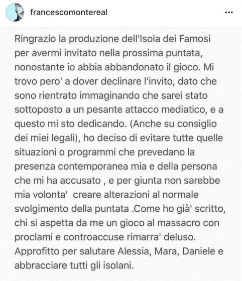 “Ringrazio la produzione dell’Isola dei Famosi per avermi invitato nella prossima puntata nonostante io abbia abbandonato il gioco“, ha scritto l’ex tronista su Instagram, “Mi trovo però a dover declinare l’invito, dato che sono rientrato immaginando che sarei stato sottoposto a un pesante attacco mediatico, e a questo mi sto dedicando. Anche su consiglio dei miei legali, ho deciso di evitare tutte quelle situazioni o programmi che prevedano la presenza contemporanea mia e della persona che mi ha accusato e per giunta non sarebbe mia volontà creare alterazioni al normale svolgimento della puntata. […] Chi si aspetta da me un gioco al massacro con proclami e controaccuse rimarrà deluso!“.