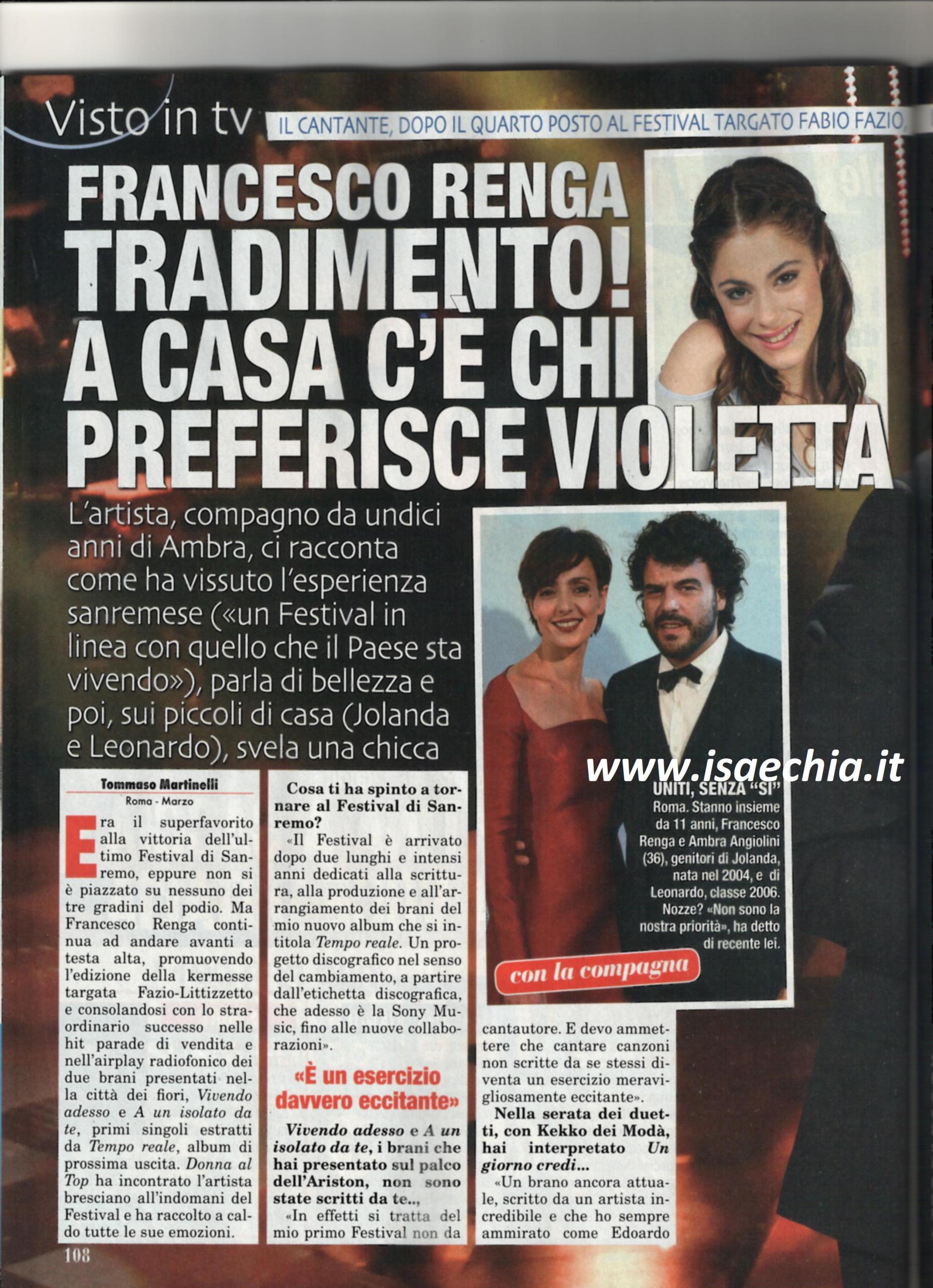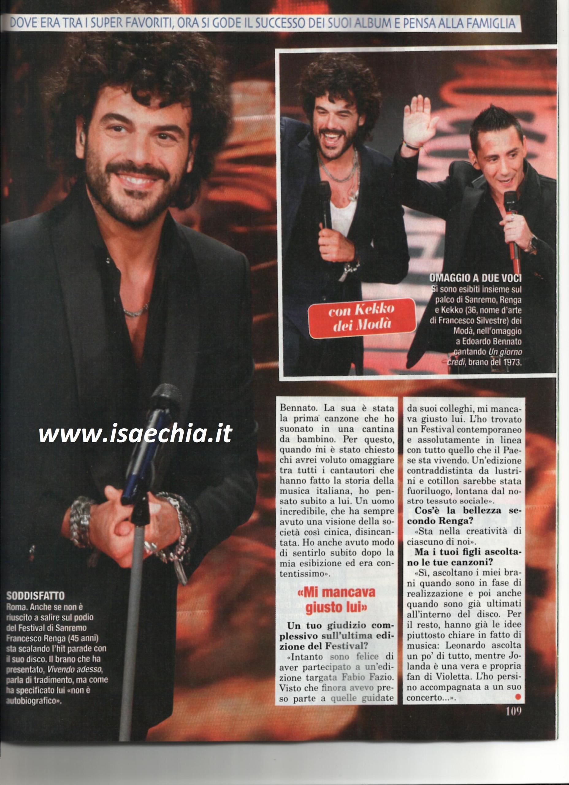 Francesco Renga partiva come superfavorito per la vittoria del Festival di Sanremo, ma si è dovuto accontentare del quarto posto. Ora, il cantante bresciano racconta: “Il Festival è arrivato dopo due lunghi anni dedicati alla scrittura e alla produzione del mio album, che è all’insegna del cambiamento, a partire dall’etichetta discografico. I miei brani di Sanremo, però, non sono stati scritti da me ed è il mio primo festival non da cantautore. Con Kekko dei Modà ho interpretato Un giorno credi, un brano ancora attuale. E’ stata la prima canzone che ho suonato da bambino e quando mi hanno chiesto quale artista italiano avrei voluto omaggiare, ho pensato a Edoardo Bennato. Ho avuto modo di sentirlo dopo l’esibizione ed era contentissimo. Sono contento di aver preso parte ad un festival targato Fabio Fazio. L’ho trovato un festival contemporaneo e in linea con il periodo che l’Italia sta vivendo. Per me la bellezza sta nella creatività di ognuno di noi”. Infine, quando gli si chiede se i suoi figli ascoltano le sue canzoni, risponde: “Sì, sia in fase di elaborazione che nel disco. Leonardo ascolta un po’ di tutto, mentre Jolanda è una vera e propria fan di Violetta: l’ho perfino accompagnata ad un suo concerto!”