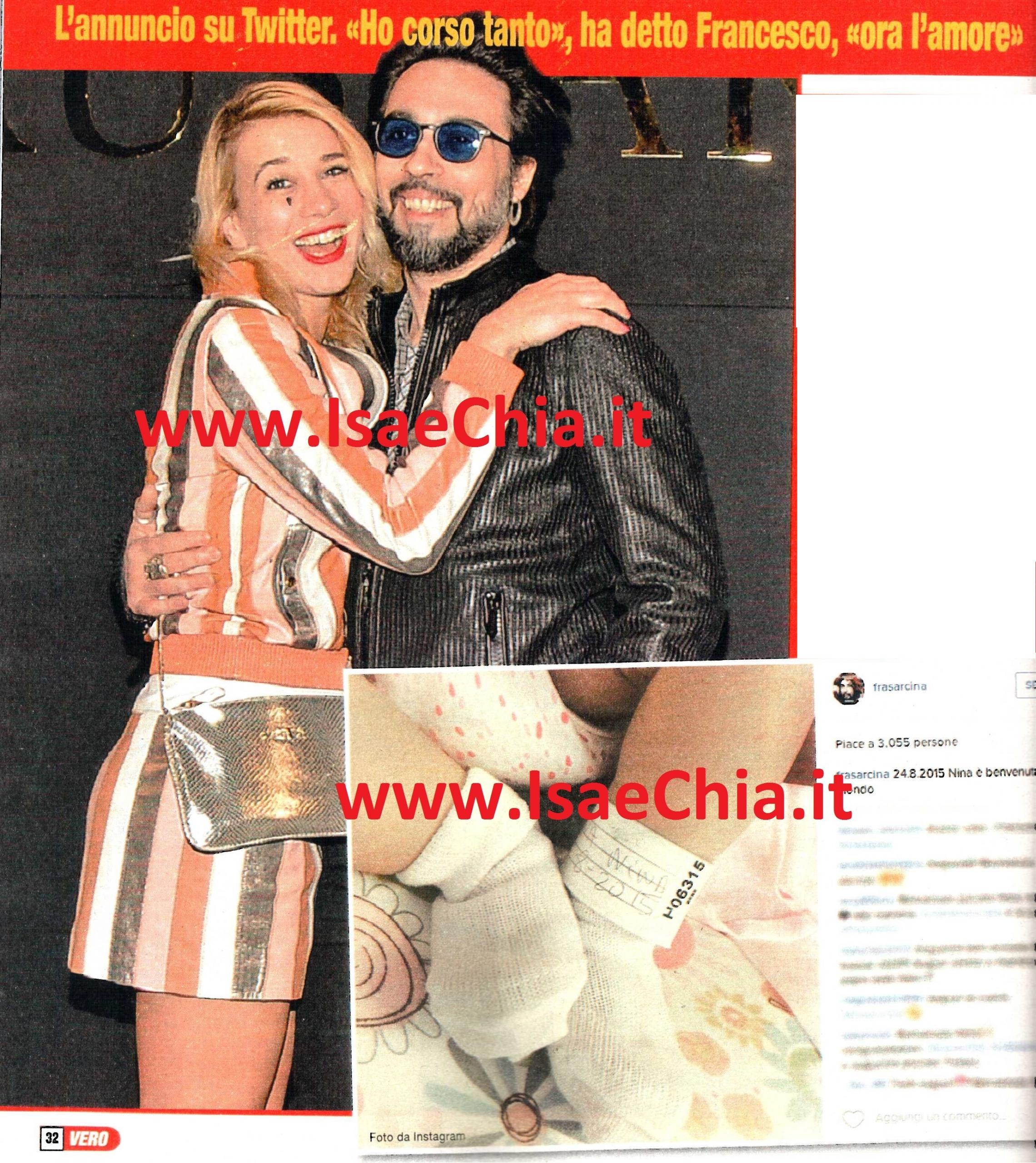 “24.8.2015. Nina è benvenuta nel mondo”. Così il cantante Francesco Sàrcina ha annunciato a tutti la nascita della piccola Nina, avuta dalla compagna Clizia Incorvaia. Per il maestro di canto di Amici si tratta del secondo figlio, dopo Tobia, il primogenito avuto da una precedente relazione. Ad accompagnare l’annuncio, una foto dei piedini della neonata. La stilista e showgirl ha partorito nella sua terra, la Sicilia. “Sono sempre stato un treno. Ora è arrivato il momento della maturità e della serietà. Mi dedico alla famiglia e all’amore” ha commentato l’ex frontman de Le Vibrazioni.