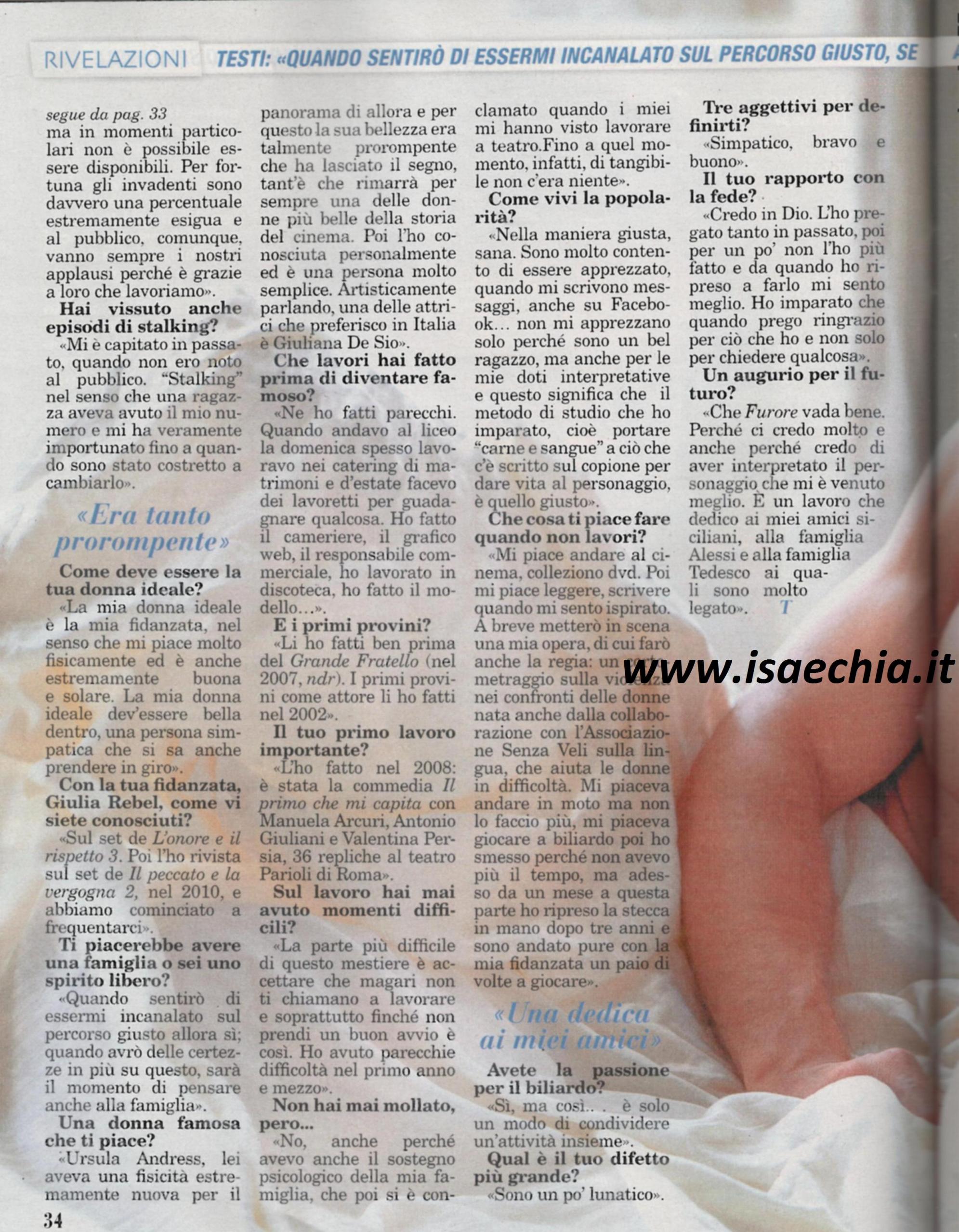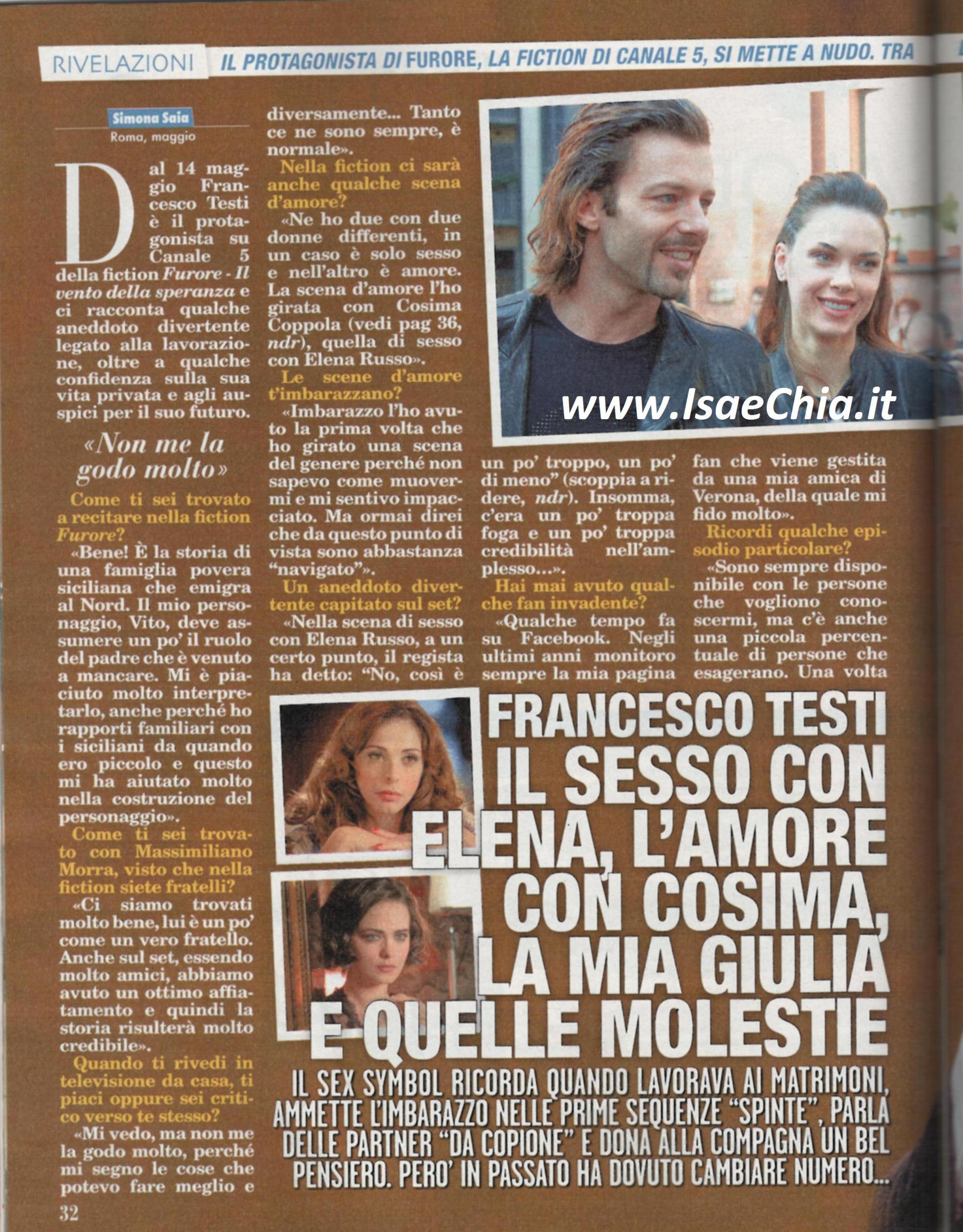 L’ex concorrente del Grande fratello Francesco Testi è uno dei protagonisti della fiction Furore: “Il mio personaggio, Vito, fa da padre in una famiglia meridionale emigrata al nord in cui il padre è venuto a mancare. Massimiliano Morra interpreta mio fratello e anche sul set abbiamo avuto un ottimo rapporto, quindi la storia risulterà più credibile. Ho due storie con due donne: con una, Elena Russo, c’è solo sesso, con l’altra, Cosima Coppola, amore. La prima volta che ho girato una scena di sesso mi sono imbarazzato perché non sapevo come muovermi, ma ormai posso dirmi abbastanza “navigato”: il regista mi ha anche detto: “No, così è un po’ troppo, un po’ meno!”. Insomma, c’era un po’ troppa foga nell’amplesso!”. L’attore racconta poi di donne che invece esagerano in altri modi: “Io cerco di essere sempre disponibile, ma in alcuni momenti non è possibile: mi è capitato di essere strattonato al punto da non potermi divincolare senza essere sgarbato. In passato, quando non ero ancora noto al pubblico, invece, una ragazza aveva avuto il mio numero e mi ha importunato fin quando sono stato costretto a cambiarlo!”. Ma il suo unico amore è Giulia Rebel: “Ci siamo conosciuti sul set di L’onore e il rispetto 3. Poi l’ho rivista sul set di Il peccato e la vergogna 2, nel 2010, e abbiamo iniziato a frequentarci. Quando sentirò di essermi incanalato sul percorso giusto e avrò delle certezze in più, penserò anche ad avere una mia famiglia”. Dopo aver ricordato gli esordi tra provini e prime commedie e aver rivelato qualche dettaglio in più su di sé, conclude: “Spero che Furore vada bene: credo di aver interpretato il personaggio che mi è venuto meglio. E’ un lavoro che dedico ai miei amici siciliani e alle famiglie Alessi e Tedesco a cui sono molto legato”.