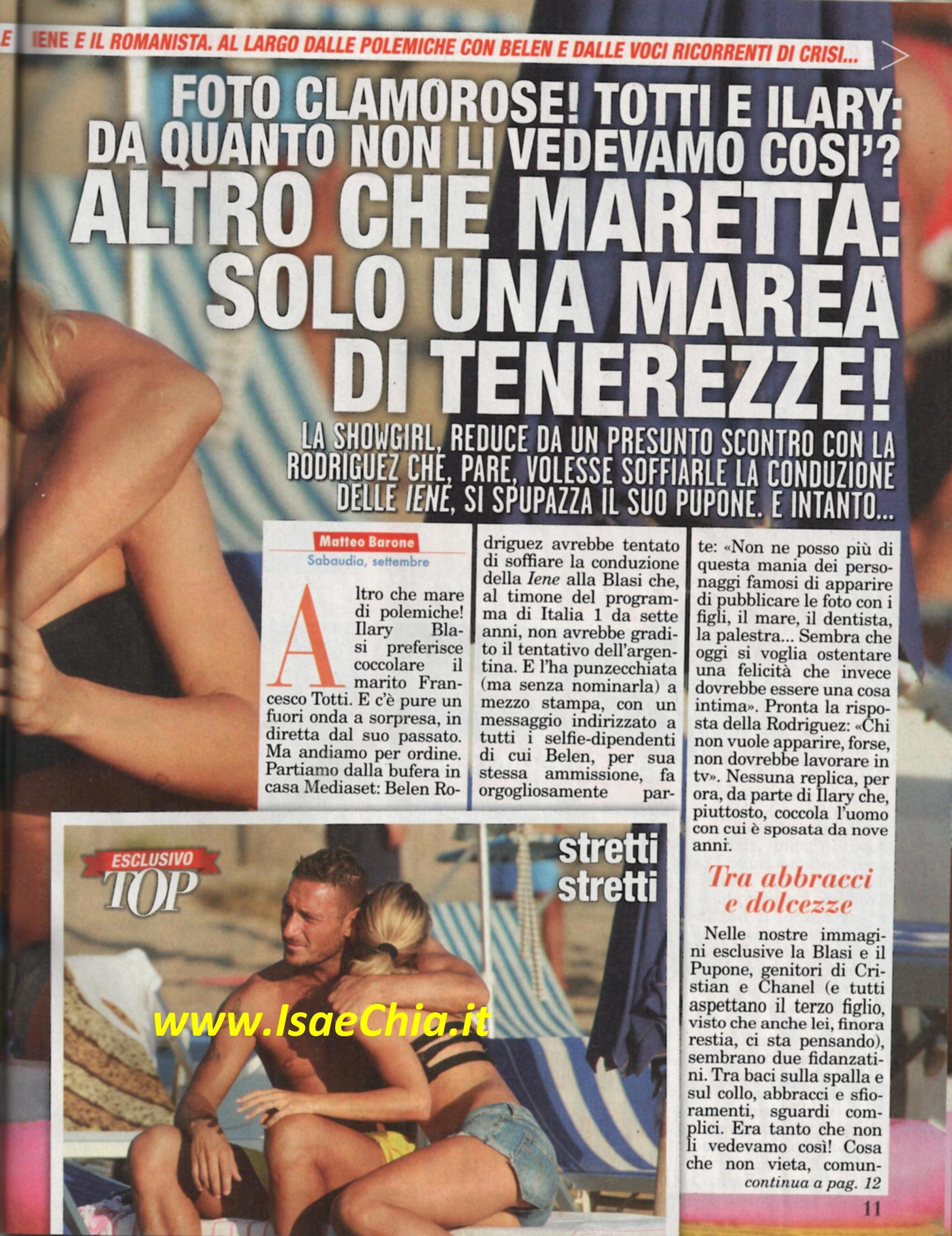 Altro che mare di polemiche! Per Ilary Blasi il mare è solo vacanza, e coccole con suo marito Francesco Totti. Ma andiamo per ordine. Belén Rodriguez avrebbe cercato di rubarle la conduzione de Le Iene, e la Blasi, che conduce il programma ormai da sette anni, non avrebbe gradito il tentativo della showgirl argentina. E l’ha punzecchiata (senza riferimenti diretti) con le sue dichiarazioni contro i selfie-dipendenti (QUI la sua intervista), alle quali la Rodriguez ha risposto con: “Chi non vuole apparire, forse, non dovrebbe lavorare in tv”. Ma al di là di tutte le questioni lavorative, Ilary è apparsa assolutamente serena, come non la si vedeva da tanto, con l’uomo che le è vicino da 9 anni ed è padre di Christian e Chanel. Baci sulla spalla, sul collo, abbracci, sfioramenti, sguardi complici sono stati fotografati sulle spiagge di Sabaudia. Poi, lui si concede un po’ di pausa con gli amici, giocando una partita a beach volley. Intanto, spunta dal passato di Ilary l’amico Michele Trentini, oggi hair stylist, in passato protagonista, insieme a lei solo sedicenne, del fotoromanzo Paolo e Francesca: “Lei, 16 anni, era alle prime armi, allegra e precisa, ascoltava tutti e imparava con umiltà. Le bastavano pochi complimenti ed era di buonumore tutto il giorno. Era una ragazzina che entrava in punta di piedi in un mondo che sembrava un po’ gioco un po’ qualcosa più grande di lei. Arrivava sempre con la mamma e ad un certo punto scritturarono anche la madre. Oggi Ilary non è cambiata, è cresciuta. Se dovessi scegliere una delle signore della tv di domani, penso a quella ragazzina che faceva sparire in pochi attimi i panini con i salumi e correva a lavarsi i denti. Oggi immagino si nutra di aria! Nelle scene con Ilary sotto le lenzuola il difficile era mantenere la serietà negli sguardi: scoppiavamo a ridere un attimo dopo lo scatto”.