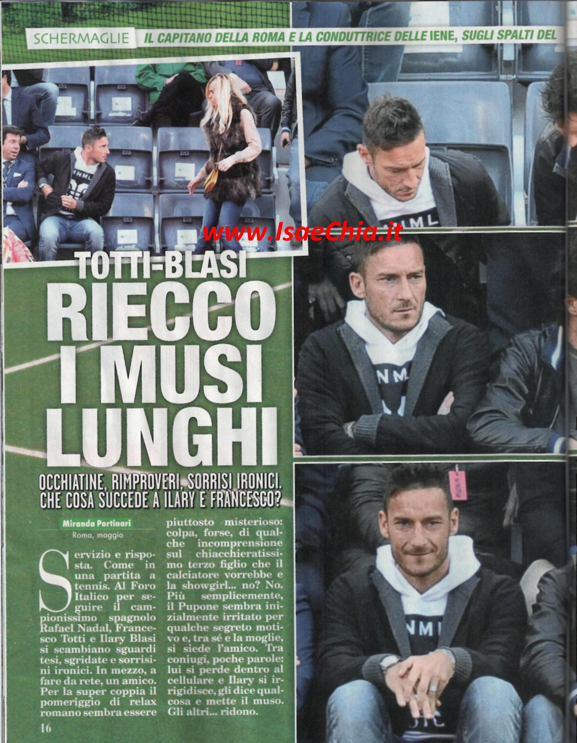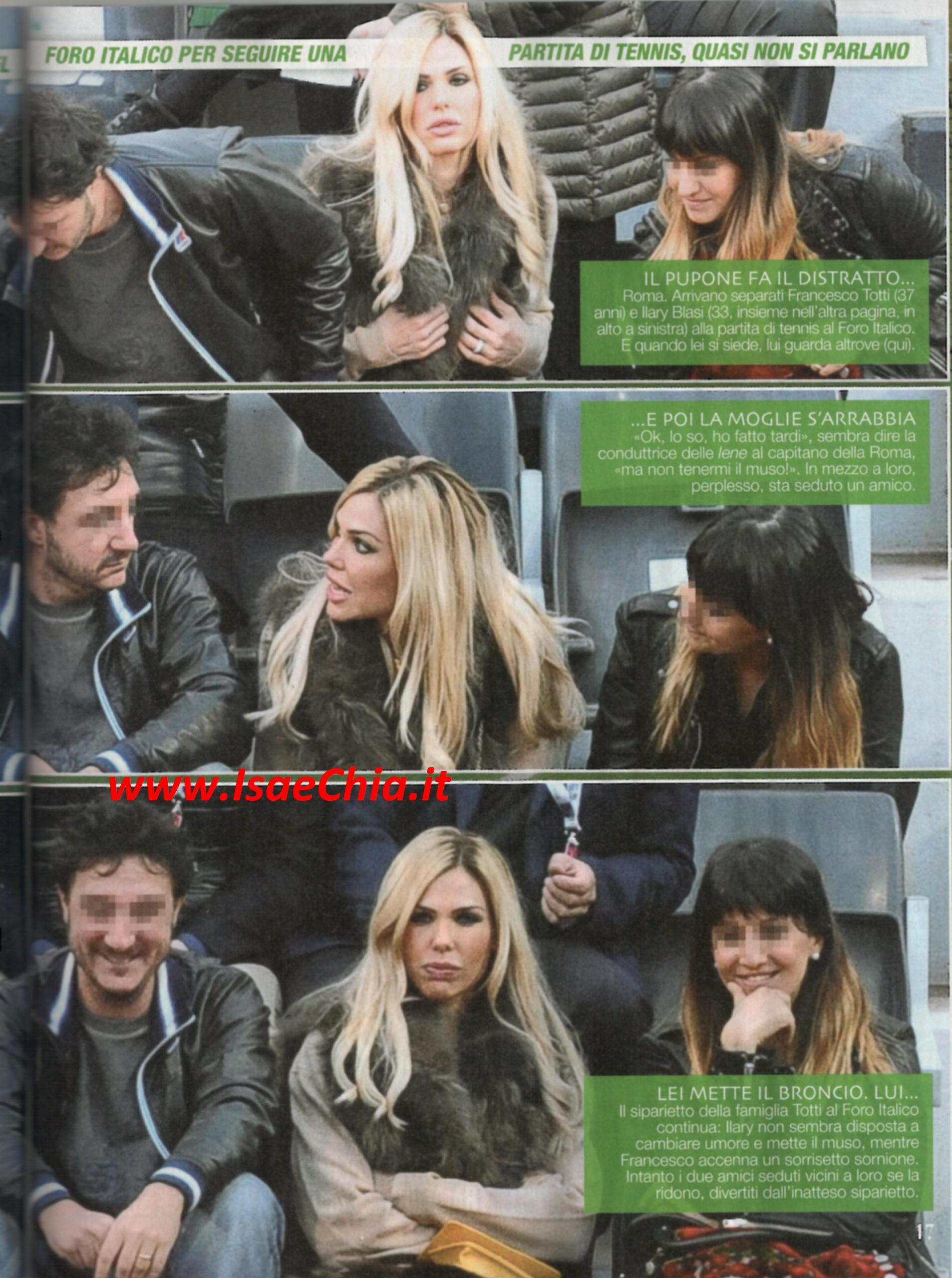 Il rapporto tra il calciatore Francesco Totti e la showgirl Ilary Blasi è proprio come una partita…a tennis! I due, al Foro Italico di Roma per seguire una partita del grande Rafael Nadal, si scambiano “servizio e risposta”. Innanzitutto, non arrivano insieme (lei è in ritardo) e si siedono anche separati, alternandosi agli amici. Quando lei si siede, lui fa il distratto e guarda altrove. Lei si arrabbia e sembra dire qualcosa come “Lo so, ho fatto tardi, ma non tenermi il muso!”, mentre l’amico seduto tra loro la guarda perplesso. Il siparietto della famiglia Totti fa sorridere gli amici, che infine coinvolgono anche il Pupone, ma la conduttrice de Le Iene mette il muso e incrocia le braccia!