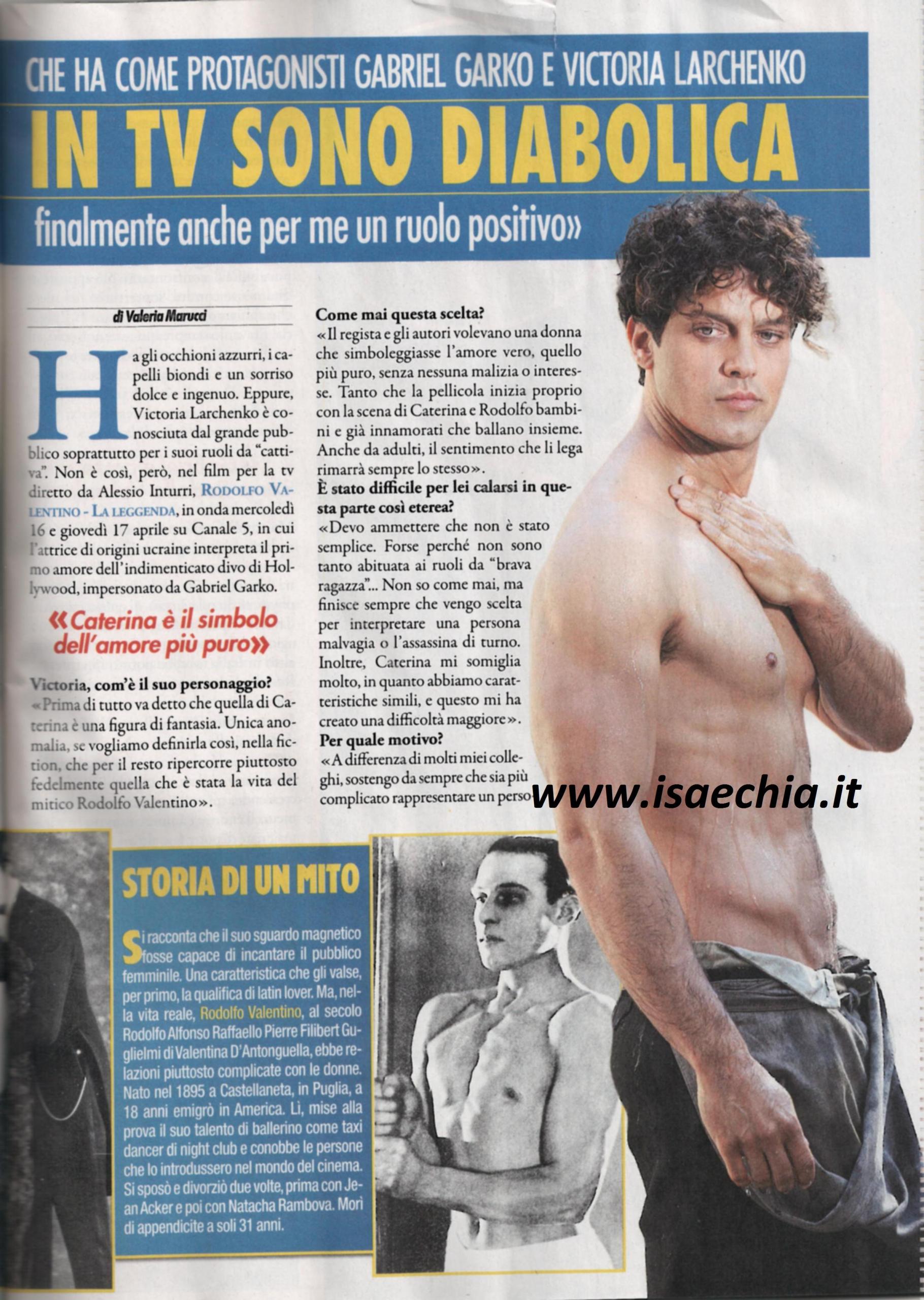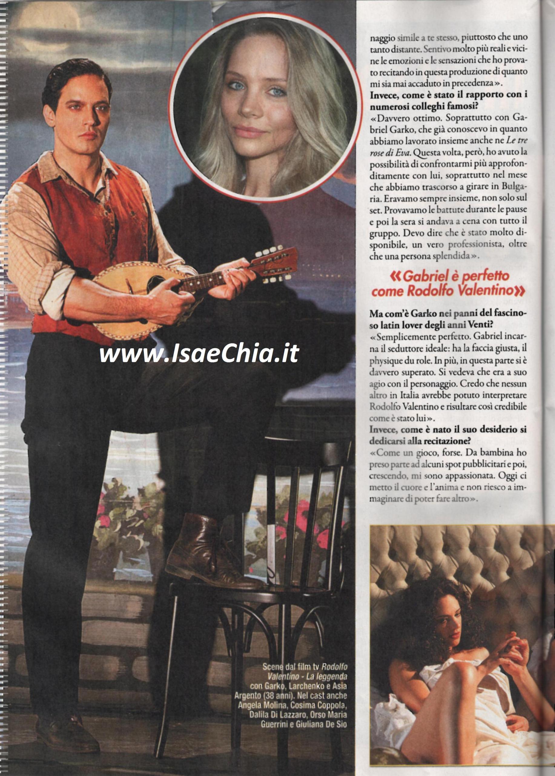 Poi, prende la parola Victoria Larchenko, che interpreta Caterina, l’unico personaggio fittizio della serie, che però rappresenta il vero amore di Rodolfo. “Con Gabriel ho già lavorato in Le tre rose di Eva, ma stavolta ho avuto modo di confrontarmi più approfonditamente con lui, specialmente durante il mese di riprese in Bulgaria. Eravamo sempre insieme, per provare le battute e fuori dal set: è molto disponibile e una persona splendida, oltre che un professionista. Nei panni di Rodolfo Valentino è semplicemente perfetto: incarna il seduttore ideale. Ha la faccia giusta e il physique du role. Credo che nessun altro in Italia sarebbe stato credibile come lui”. Dopo aver parlato dei suoi studi in Economia e dei progetti lavorativi (“Inizieremo a breve le riprese per la terza stagione di Le tre rose di Eva e dovrebbe uscire in Italia La bella gente, che è uscita in Francia due anni fa”), la bella attrice rivela: “Non c’è nessun fidanzato. Sono sola e voglio rimanerci per un po’. Voglio concentrarmi sulla mia priorità, il lavoro. L’amore può attendere”.