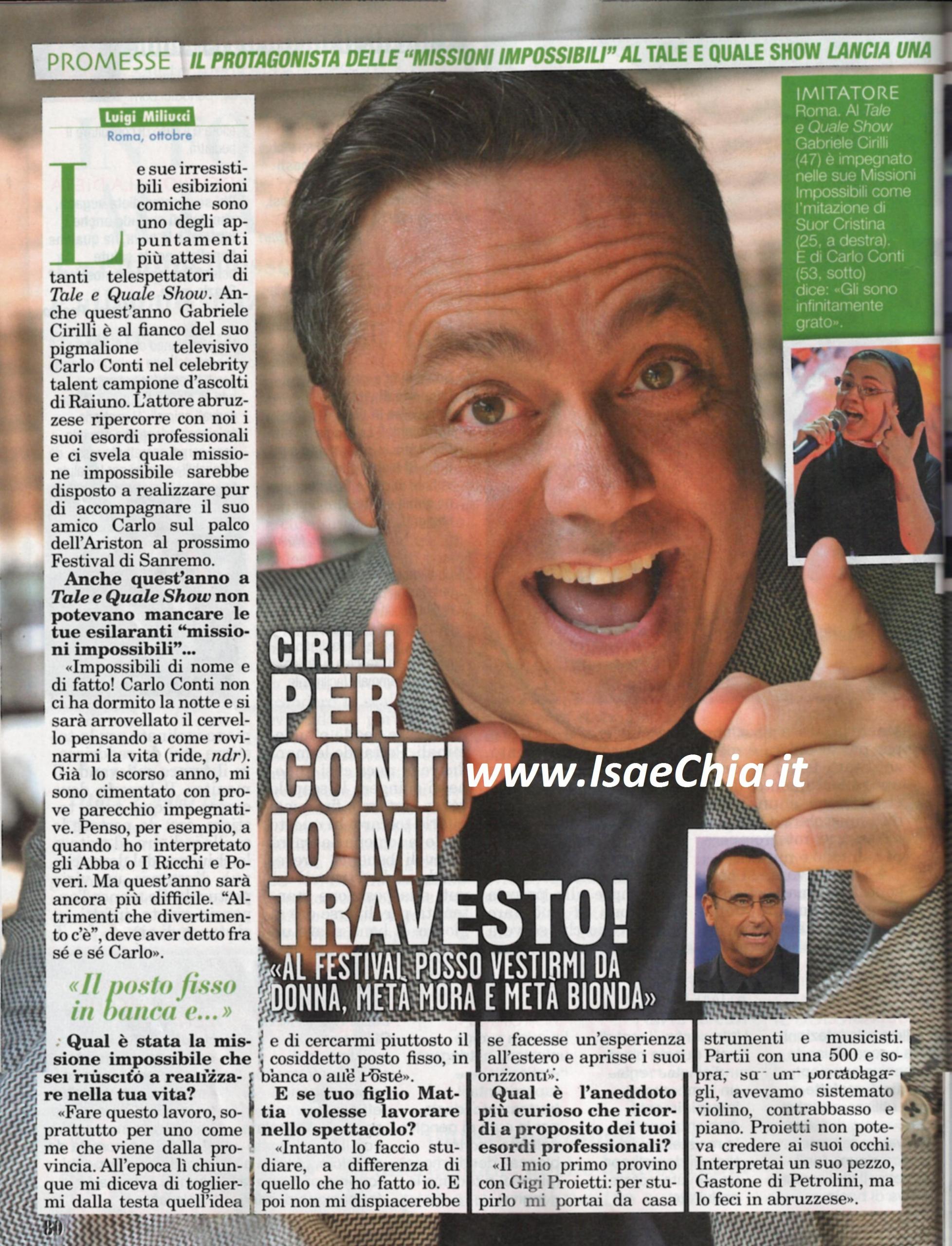 Le irresistibili imitazioni di Gabriele Cirilli sono ormai tra i momenti più attesi del Tale e quale show e hanno raggiunto un tale livello da essere considerate delle “Missioni impossibili”: “Impossibili di nome e di fatto!” esclama il comico. “Carlo Conti ha pensato di notte a come rovinarmi la vita! Già lo scorso mi sono cimentato con prove impegnative, come gli Abba o i Ricchi e Poveri, ma quest’anno sarà ancora più difficile. La mia missione impossibile nella vita, invece, è stata riuscire a fare questo lavoro, per uno come me che viene alla provincia. Mi dicevano i togliermi quell’idea dalla testa e di cercare un posto fisso in banca o alle Poste! Al primo provino, con Gigi Proietti, partii da casa con strumenti e musicisti. Proietti non poteva credere ai suoi occhi: feci il suo pezzo Gastone di Pretolini in abruzzese! A lui devo tanto perché mi ha dato la possibilità di fare questo lavoro, ma Conti nel 2000 mi ha chiamato a Sanremo Estate e a allora abbiamo collaborato sempre. Gli auguro che il suo Festival di Sanremo vada bene. Se questo può significare anche una mia partecipazione, ben venga. Sono pronto a travestirmi da donna: metà mora e metà bionda!”