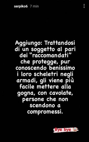 Non ho ricevuto nessuna denuncia e nessuna querela da parte di nessuno, non mi è arrivato mai niente a casa a Roma. Non sono l’ex di nessuno ma sono Mario Serpa. Vorrei ricordare al signorino, che gli piace raccontare ai suoi follower la vita degli altri ovviamente raccontando stron*ate, vorrei che raccontasse ai suoi follower quello che mi ha raccontato in macchina nel tragitto Milano – studi di Verissimo su un uomo e una donna. Vediamo se ha il coraggio di raccontarlo ai suoi follower, oppure ti piace soltanto sput*anare.
