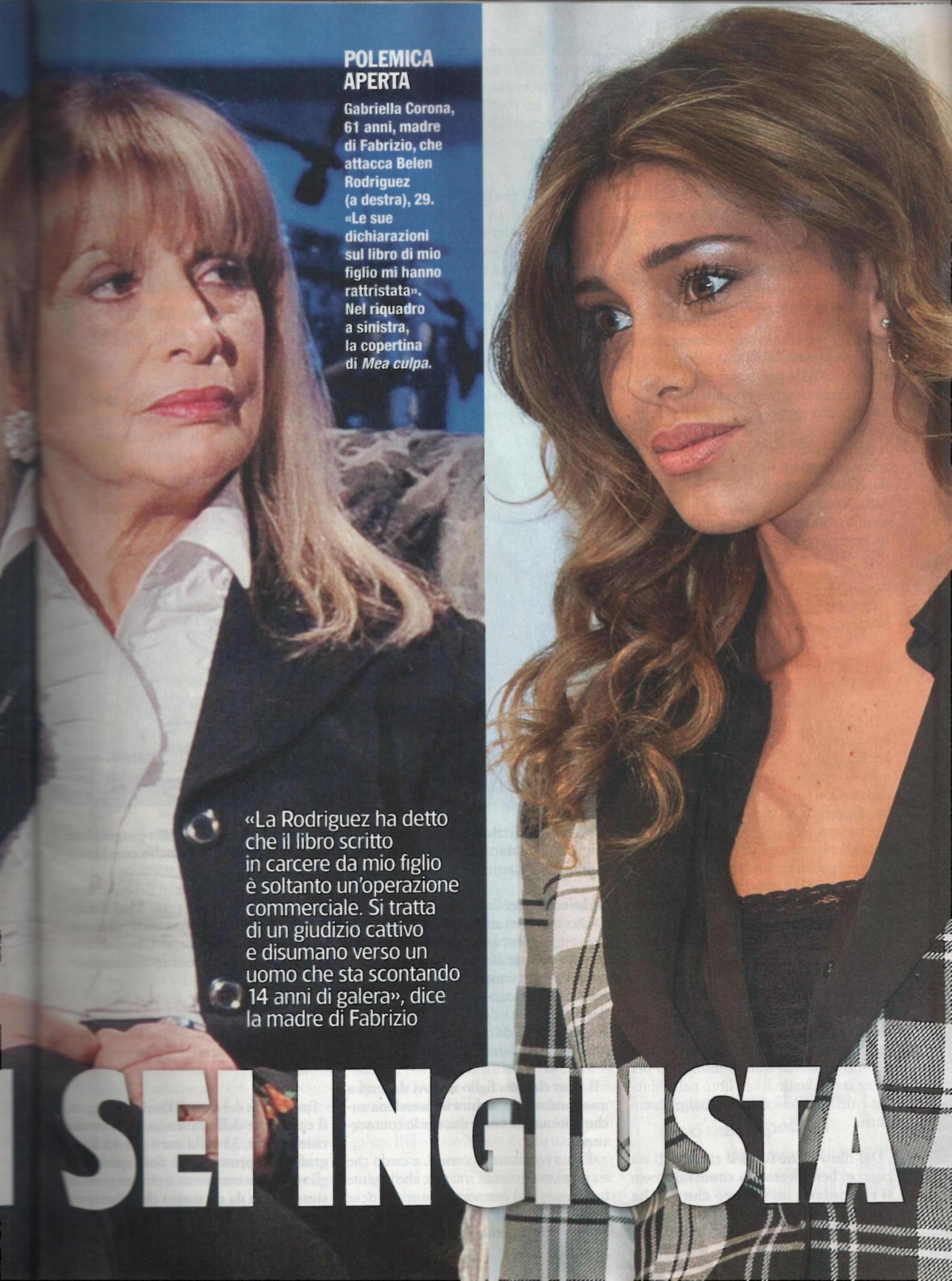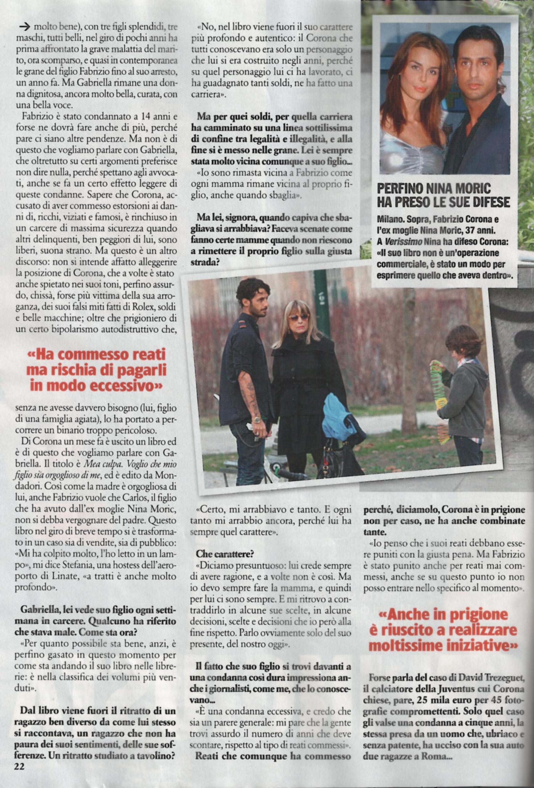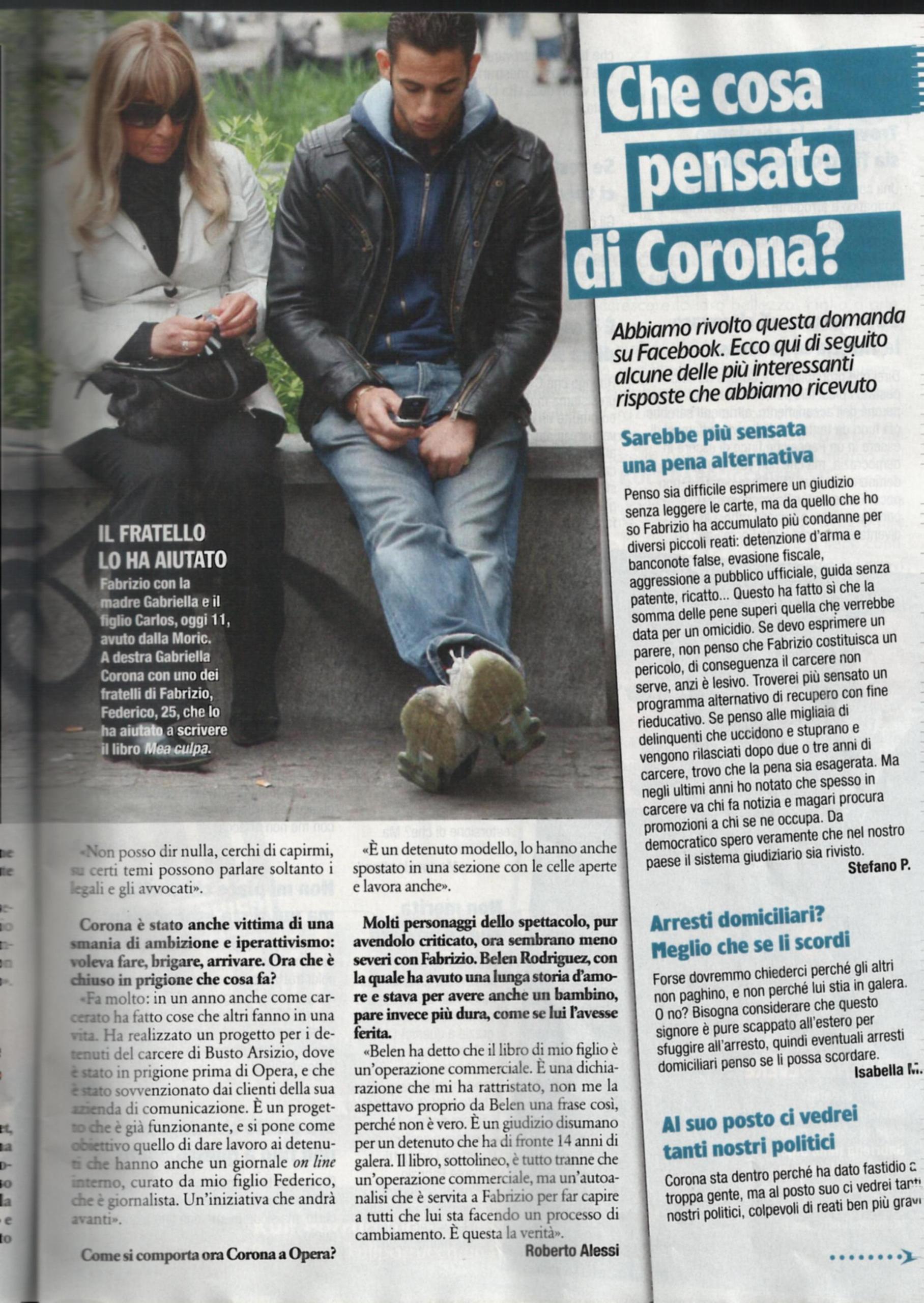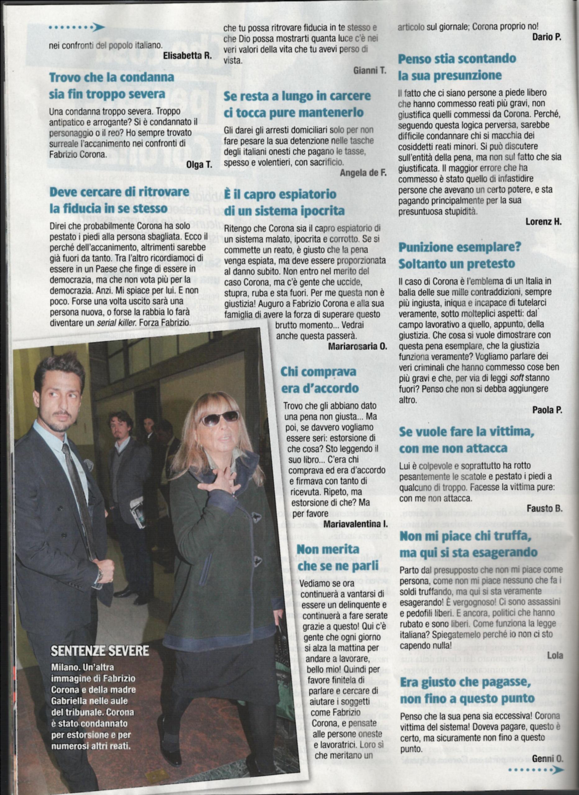 La signora Gabriella, madre di Fabrizio Corona, ha dapprima affrontato la malattia e la morte del marito, il giornalista Vittorio, e poi l’arresto del figlio, condannato a 14 anni in un carcere di massima sicurezza. Adesso, si ritrova a difendere il figlio dalle critiche giunte contro il suo libro Mea culpa. Voglio che mio figlio sia orgoglioso di me: “Per quanto possibile, mio figlio sta bene. Si è perfino gasato per le vendite del libro, che è tra i volumi più venduti. Viene fuori il suo carattere vero, e non il personaggio che si è costruito negli anni e su cui ha guadagnato tanti soldi. Io capivo che sbagliava e mi arrabbiavo e mi arrabbio tuttora, perché ha ancora quel carattere presuntuoso, ma come ogni mamma sono sempre vicina a mio figlio, anche se non condivido le sue scelte. E’ stato condannato ad una pena eccessiva, mi pare che la gente trovi assurdo il numero di anni che deve scontare, rispetto ad altri reati commessi. Ed è stato anche punito per reati che non ha commesso. E’ un detenuto modello, lo hanno spostato in una sezione con le celle aperte, dove lavora anche e ha messo in piedi un progetto per dare lavoro ai detenuti”. Infine, la signora Corona parla delle critiche che l’ex di Fabrizio, la showgirl Belén Rodriguez ha rivolto nei confronti del libro: “Ha detto che è un’operazione commerciale. E’ una dichiarazione che mi ha rattristato. Non me l’aspettavo proprio da Belén, perché non è vero. E’ un giudizio disumano contro una persona che ha di fronte 14 anni di galera. Il libro è tutto fuorché un’operazione commerciale, è un’autoanalisi che è servita a Fabrizio per far capire a tutti che il suo è un processo di cambiamento”.
