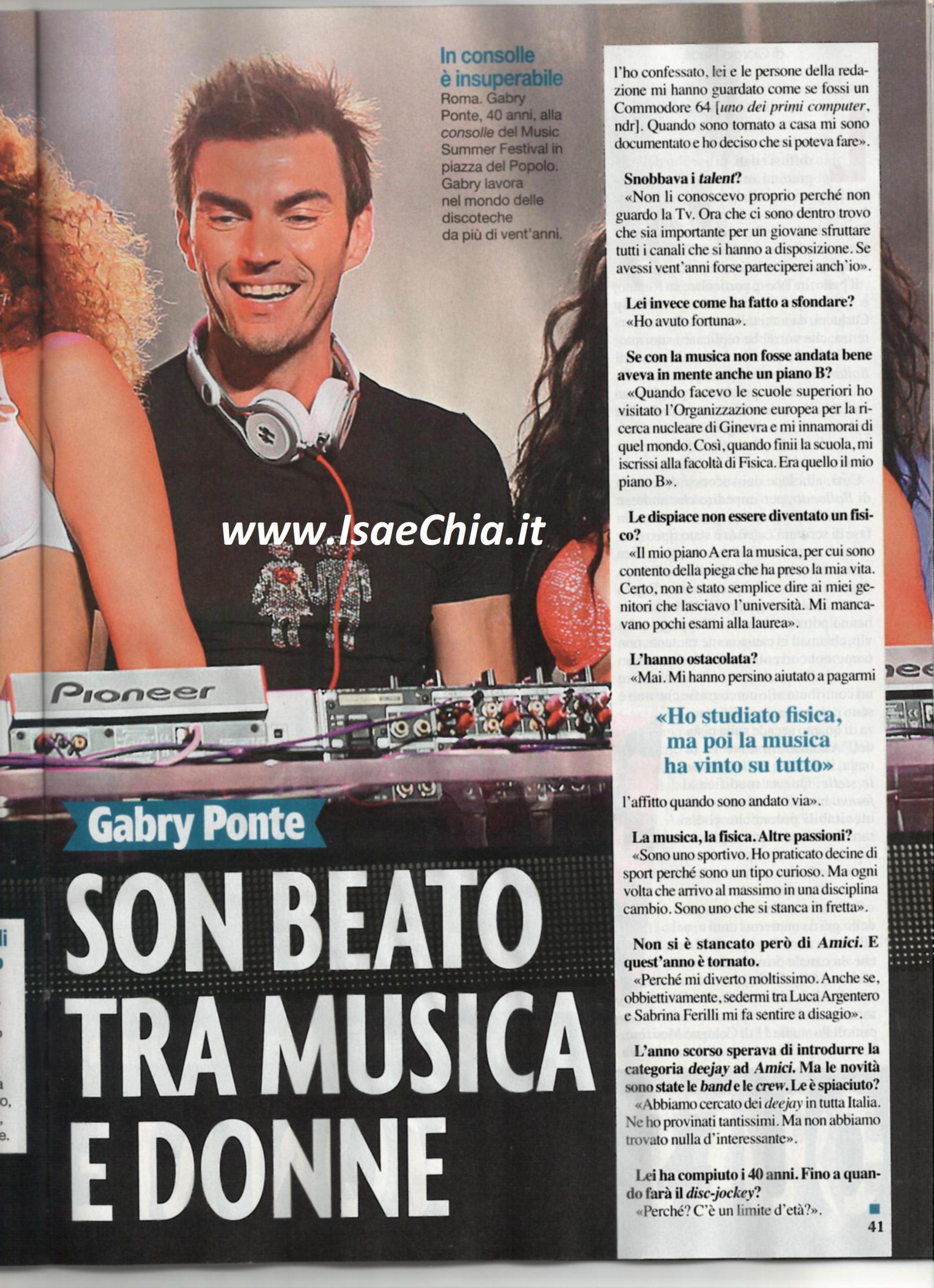 Il dj Gabry Ponte è anche quest’anno, insieme agli attori Luca Argentero e Sabrina Ferilli, nella giuria di Amici. Quando gli si chiede dei flirt attribuitigli, tra cui quello con Marcella del gruppo Lollipop, risponde: “Non dico nulla, se non che mi faccio una bella risata quando leggo queste cose. Ho imparato a rispondere No comment, ma non perché me la voglio tirare, ma solo perché internet può essere uno strumento pericoloso e nascondere tanta cattiveria”. Circa la sua partecipazione ad Amici, invece, dice: “Era da anni che mi offrivano programmi in tv, ma non erano nelle mie corde. Quando mi hanno chiamato per Amici è stato diverso: devo dare giudizi sulla musica e questo è il mio lavoro. Detto questo, non mi fa saltare di gioia che mi riconoscano per strada: prima il mio pubblico erano i ragazzi in discoteca, oggi anche le mamme e le nonne. Non avevo mai visto Amici, e al primo incontro con Maria De Filippi e la redazione mi hanno guardato come se fossi un Commodore 64, uno dei primi computer. Non conoscevo i talent perché non guardo la tv, ma ora che ci sono dentro, credo sia importante per un giovane sfruttare tutti i canali che si hanno a disposizione. Se avessi 20 anni, forse parteciperei anch’io. Io ho avuto fortuna, ma avevo anche un piano B: mi iscrissi alla Facoltà di Fisica, perché avevo visitato l’Organizzazione europea per la ricerca nucleare di Ginevra e mi innamorai di quel mondo. Mi mancavano pochi esami alla laurea e non è stato facile dire ai miei che avrei lasciato. Non mi hanno ostacolato, mi hanno persino aiutato a pagare l’affitto quando sono andato via”. Infine, conclude: “Sono tornato perché mi diverto tantissimo, anche se sedermi tra Argentero e la Ferilli mi fa sentire a disagio. Abbiamo tentato di inserire la categoria deejay, provinandone in tutta Italia, ma non abbiamo trovato nulla di interessante”. E quando gli si chiede fin quando continuerà a farlo, risponde: “Perché, c’è un limite d’età?”