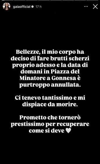 Gaia, infatti, ha spiegato di avere un problema di salute e di essere quindi costretta ad annullare la data, sebbene con molto dispiacere. La cantante ha preferito non scendere nei dettagli, ma ha promesso che presto ci sarà modo di recuperare: