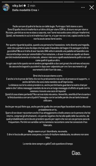 Le cose, però, a quanto pare, sono andate tutt’altro che bene, perché nei giorni scorsi, sul suo profilo InstagramVittoria ha pubblicato una lunga serie di storie in cui ha raccontato nel dettaglio la sua versione dei fatti e ha spiegato perché Gaia l’avrebbe cacciata di casa; d’altro canto, Vittoria, si è sentita usata a fare da dogsitter al suo cane (ne abbiamo parlato QUI).