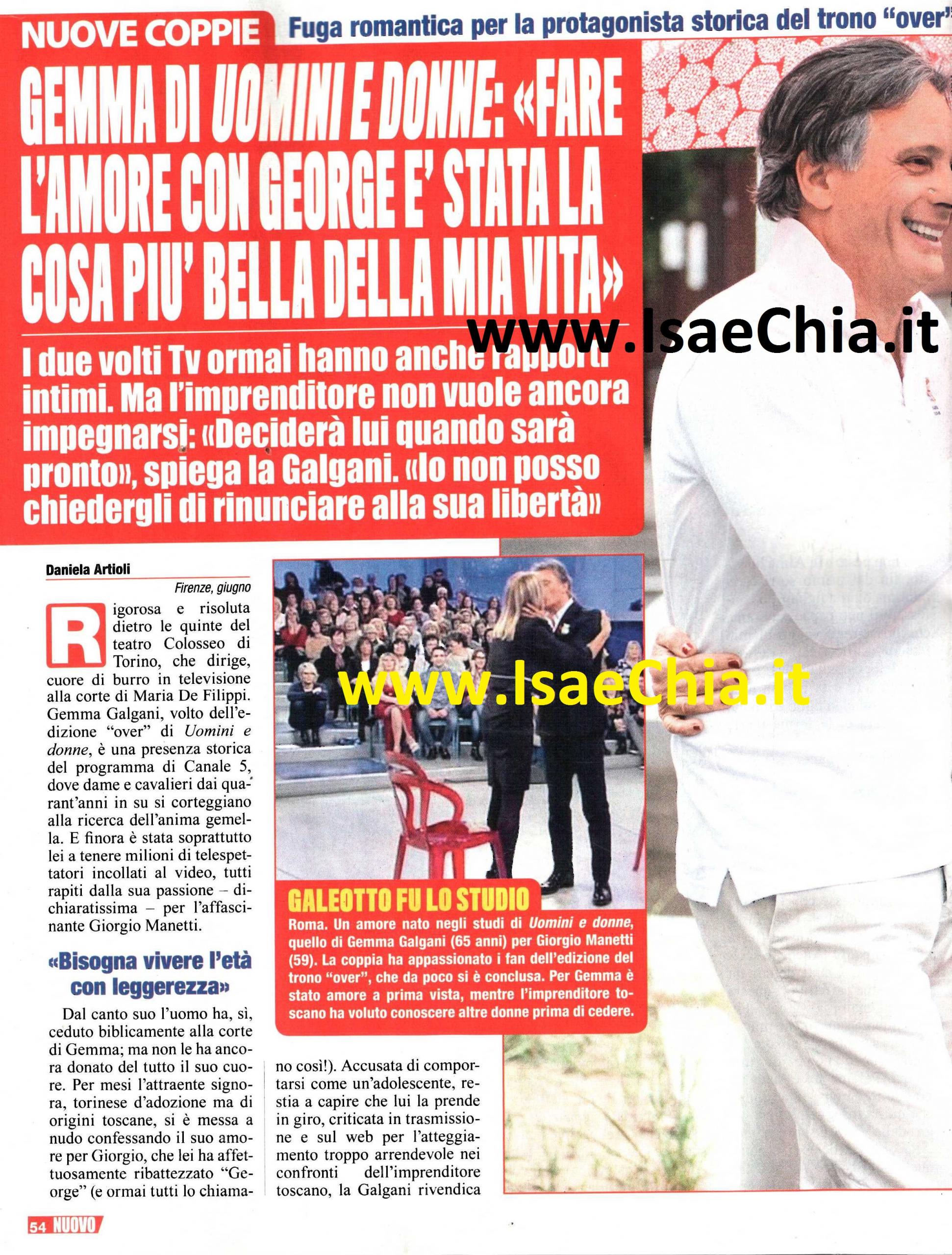 Come hanno dimostrato i dati d’ascolto, la storia tra Gemma Galgani e Giorgio Manetti è stata seguitissima dal pubblico a casa e ha risollevato il Trono Over da una leggera flessione registrata nella prima parte di questa stagione televisiva. Il merito è sicuramente della dama torinese, che, caparbia e risoluta, ma al contempo incredibilmente ingenua e romantica, ha lottato per l’affascinante ‘George‘, senza però esser ancora riuscita a conquistare del tutto il suo cuore: “Dopo tanto tempo da sola, penso di essermi meritata di vedere il lato positivo anche in una situazione difficile. Il sogno di tutte noi sarebbe quello di essere ragazzine per sempre, ma ciò che conta è vivere la propria età con leggerezza” esordisce lei. Quando le si fa notare lo scetticismo dei più, che si oppone alla sua fiducia illimitata in questa storia, Gem risponde: “Innanzitutto sono un’ottimista. Lui non si è dichiarato, ma io ho coraggio. Un coraggio che disarma tutti. Gli altri non riescono a capire come io possa sopportare una situazione che appare fugace e passeggera, ma io sono felice. Quando sono con George sto talmente bene e i momenti passati insieme sono così belli e completi che riesco a non curarmi di quello che pensa chi mi sta intorno. Io mi sento più innamorata che mai, anche se capisco che questo compromesso possa sembrare inaccettabile. Non voglio sembrare un’eroina dei tempi andati: noi abbiamo una vita di coppia piena e ricca di trasporto in ogni istante. Usciamo alla luce del sole, anche se ufficialmente non stiamo insieme. Io non posso togliergli la libertà mentale, né voglio cambiarlo. Sarebbe veramente una forma di egoismo da parte mia. E poi George racchiude tutto ciò che io voglio in un uomo: è sensibile, attento, mi dà grande carica. E’ vero che è molto corteggiato, ma questo non mi toglie la gioia e la speranza che il mio entusiasmo possa portare anche lui in una direzione di maggior apertura nei miei confronti. Ho trascorso un periodo lunghissimo nella più assoluta solitudine, in tutti i sensi. Erano almeno sei anni che non avevo una storia, perché nella vita mi sono sempre concentrata sul lavoro. Per vent’anni ho diretto il Teatro Alfieri di Torino e ora sono al Colosseo. Questo mestiere mi ha fatto conoscere un mondo particolare, tanti artisti. E secondo i criteri che ho affinato in tanti anni, posso dire che George rappresenta tutte le caratteristiche che mi piacciono in una persona. Non è superficiale, ha una profondità incredibile e una capacità analitica che non ho mai riscontrato. Bisogna capire che lui è arrivato alla sua età ancora single, dunque io non posso permettermi di avere crisi di onnipotenza. Lo lascio libero di decidere e quando si sentirà pronto, prenderà la sua decisione“. Quando le si dice che forse è sorda a tutte le critiche perché sa che in fondo la loro relazione è completa, Gemma risponde: “Se ti riferisci al fatto che siamo stati insieme anche nell’intimità, voglio chiarire che è accaduto perché sono innamorata di lui, altrimenti non sarebbe mai successo. Non fa parte delle mie abitudini: donarmi a lui è stata una scelta voluta dal cuore e dal cervello, determinata dall’arrivo di un grande amore. La prima volta non ho avuto ansie e il merito è stato suo: ha creato una situazione accogliente e piena d’amore, con la sensibilità e il tatto di un signore d’altri tempi. Effettivamente avevo un po’ di preoccupazione ma il suo modo di condurmi per mano e farmi scivolare tra le sue braccia e stato così gentile e garbato da non farmi sentire il minimo disagio. E lo confesso con le lacrime agli occhi: mi ha tenuto talmente tanto in considerazione che ha reso quel momento uno dei più belli di tutta la mia vita. Se prima mi piaceva tanto, dopo mi è piaciuto ancora di più. La mia forma d’amore non è debolezza: io non sono lo zerbino di George. E’ molto facile ottenere le cose semplici, ma è molto più importante conquistare quelle difficili. E’ vero, io sto inseguendo una storia, ma George c’è, esiste. E io non sono una comparsa. Ormai faccio parte della sua vita“.