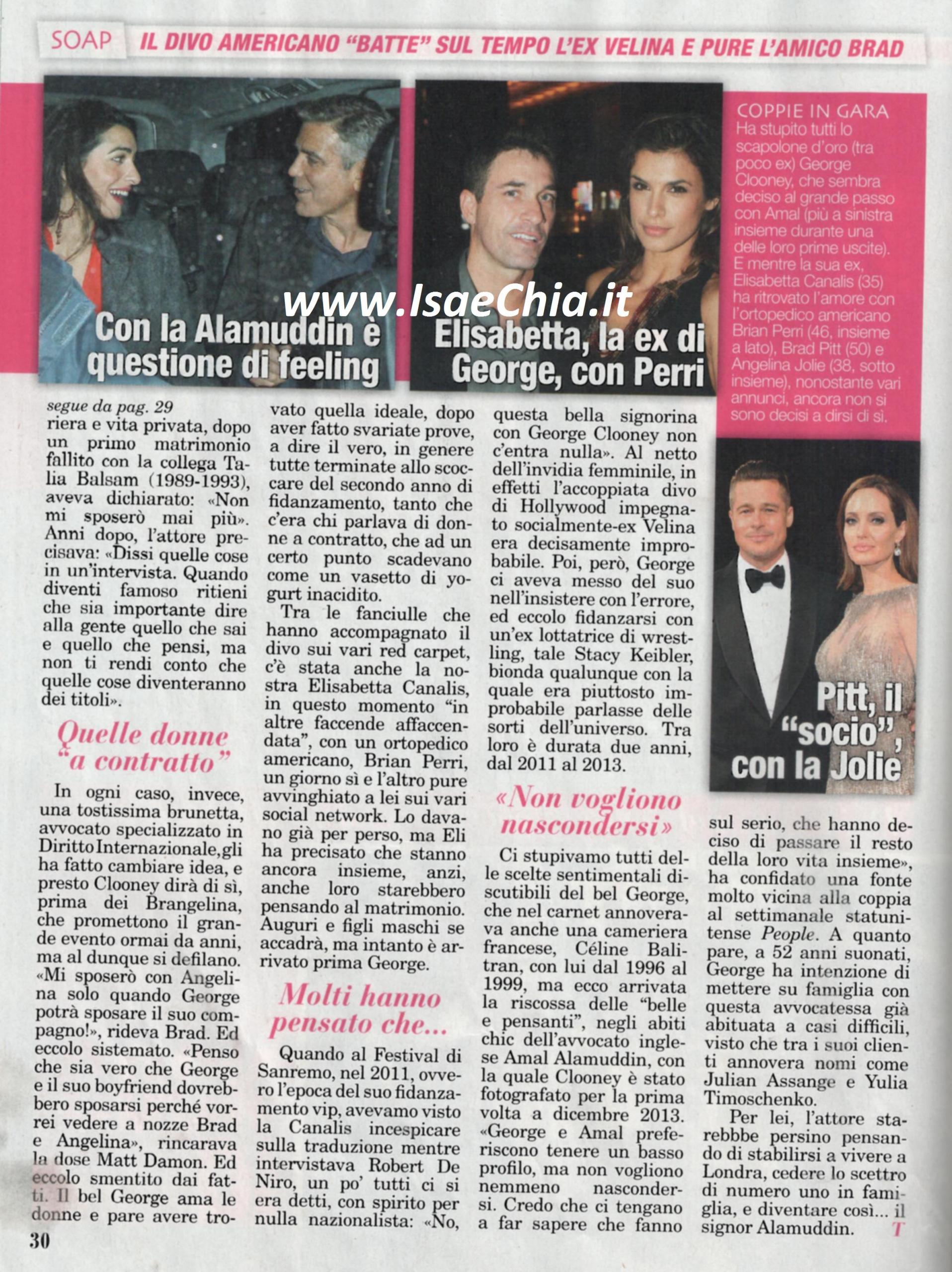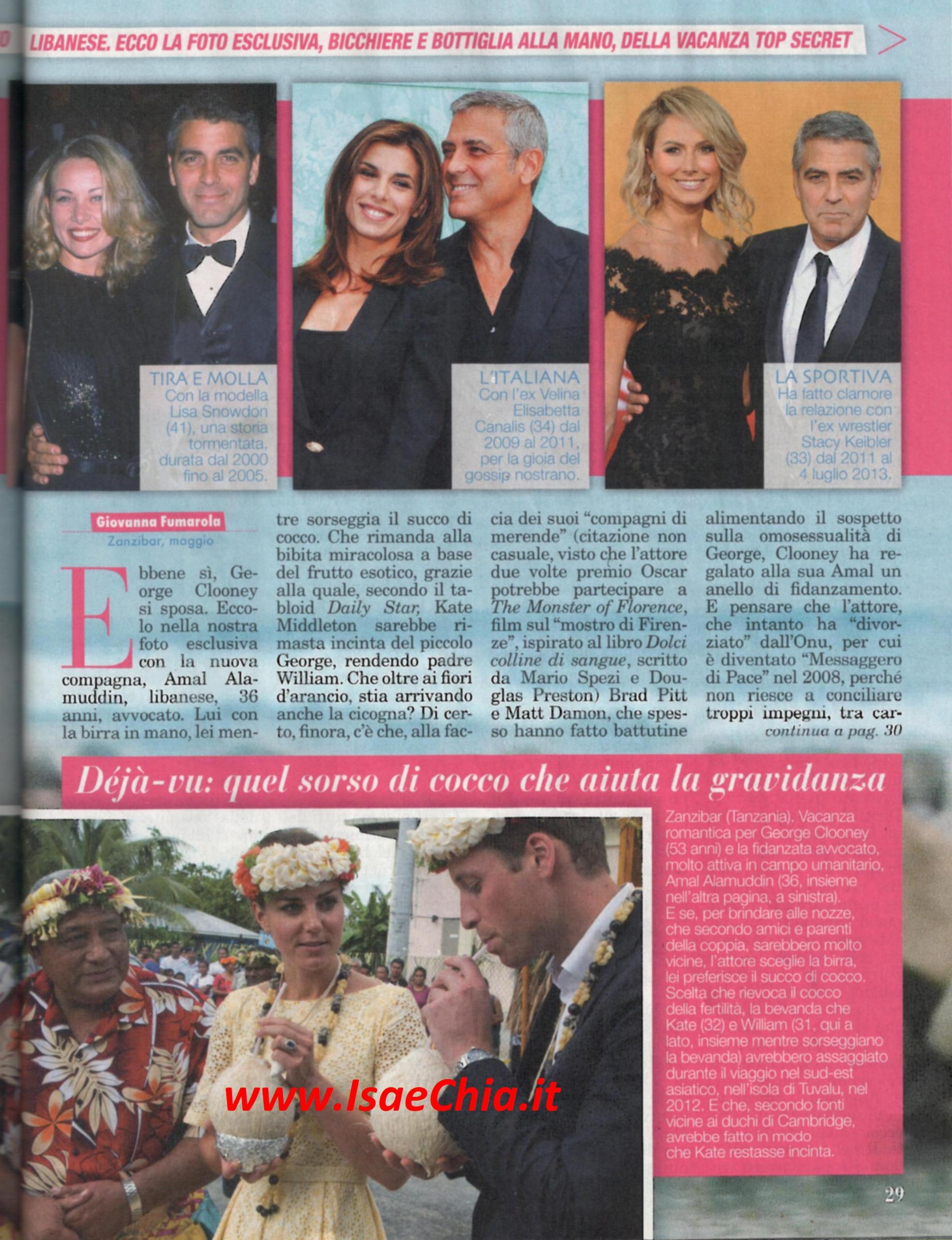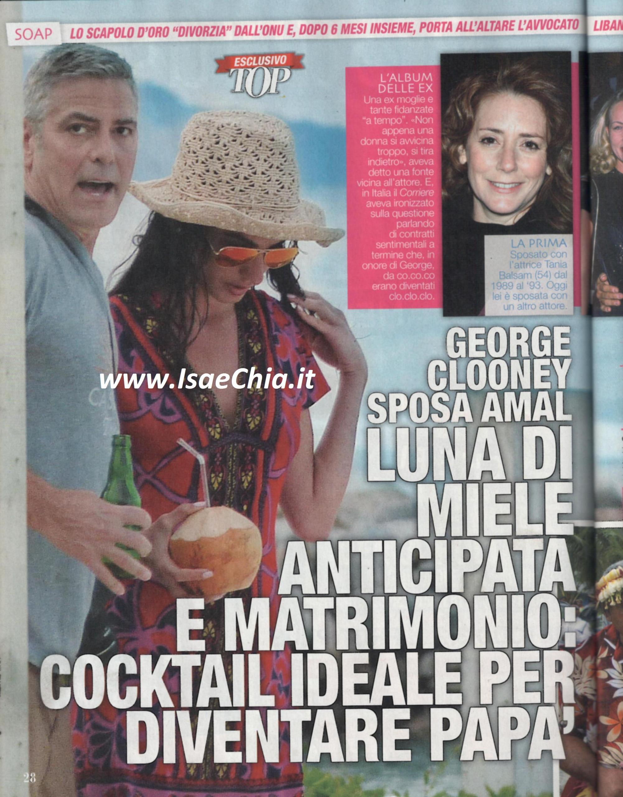 Stavolta, pare sia vero: George Clooney si sposa. La fortunata è Amal Alamuddin, libanese, 36 anni, avvocato. L’attore hollywoodiano, in realtà, si era già sposato nel 1989 con la collega Tania Balsam, e dopo la fine del matrimonio è stato con la modella Lisa Snowdon e la nostrana Elisabetta Canalis. Poi, è arrivata l’ex wrestler Stacy Keibler, ma anche questa storia è finita. Adesso, insieme ad Amal a Zanzibar, si rilassa con una birra, mentre lei sorseggia il succo di cocco, proprio come la reale d’Inghilterra Kate Middleton, che pare sia rimasta incinta dopo aver bevuto la stessa bevanda. Clooney aveva dichiarato “Non mi sposerò mai più” ma poi ha ritrattato: “Dissi quelle cose in un’intervista, ma non ti rendi conto che quelle cose diventeranno dei titoli”. I suoi “amici” Matt Damon e Brad Pitt, invece, hanno più volte fatto delle battutine che alludevano alla sua omosessualità, del tipo: “Mi sposerò con Angelina Jolie solo quando George potrà sposare il suo compagno”. Quale sarà la verità? Per ora, “George e Amal preferiscono tenere un basso profilo, ma non vogliono nemmeno nascondersi. Ci tengono a far sapere che hanno deciso di passare il resto della vita insieme” ha rivelato una fonte vicina al settimanale People. Sarà così?