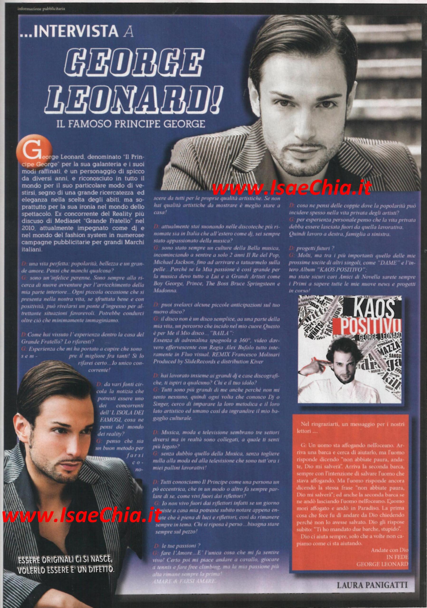 Il concorrente del Grande fratello 10 George Leonard racconta la sua vita a più di quattro anni dalla partecipazione al reality: “Sono un infelice perenne, sempre alla ricerca di nuove avventure e di arricchimento della mia parte interiore. Il GF è stata un’esperienza che mi ha aiutato a capire che sono sempre il migliore fra tanti. Lo rifarei, certo, ma come unico concorrente! L’isola dei famosi? Penso che sarebbe un’ottima occasione per farsi conoscere da tutti per le proprie qualità artistiche. Se non ne hai, è meglio starsene a casa”. Infatti, il gieffino si sta dedicando alla sua grande passione, la musica: “Il mio disco non è un semplice disco, è una parte della mia vita, è essenza di adrenalina spagnola. Ho lavorato con grandi nomi e non mi sento nessuno. Cerco di imparare la loro metodica e il loro lato artistico e umano, ingrandendo il mio bagaglio culturale”. Infine, quando gli si chiede della sua vita al di là dello spettacolo, risponde: “Io non vivo fuori dai riflettori. Infatti, se un giorno veniste a casa mia, vedreste che è piena di luci e riflettori. Chi si ferma è perduto e bisogna stare sempre sul pezzo! La mia passione? Fare l’amore. E’ l’unica cosa che mi fa sentire vivo. Poi giocare a tennis, andare a cavallo e free-climbing, ma la mia passione rimane sempre la prima!”