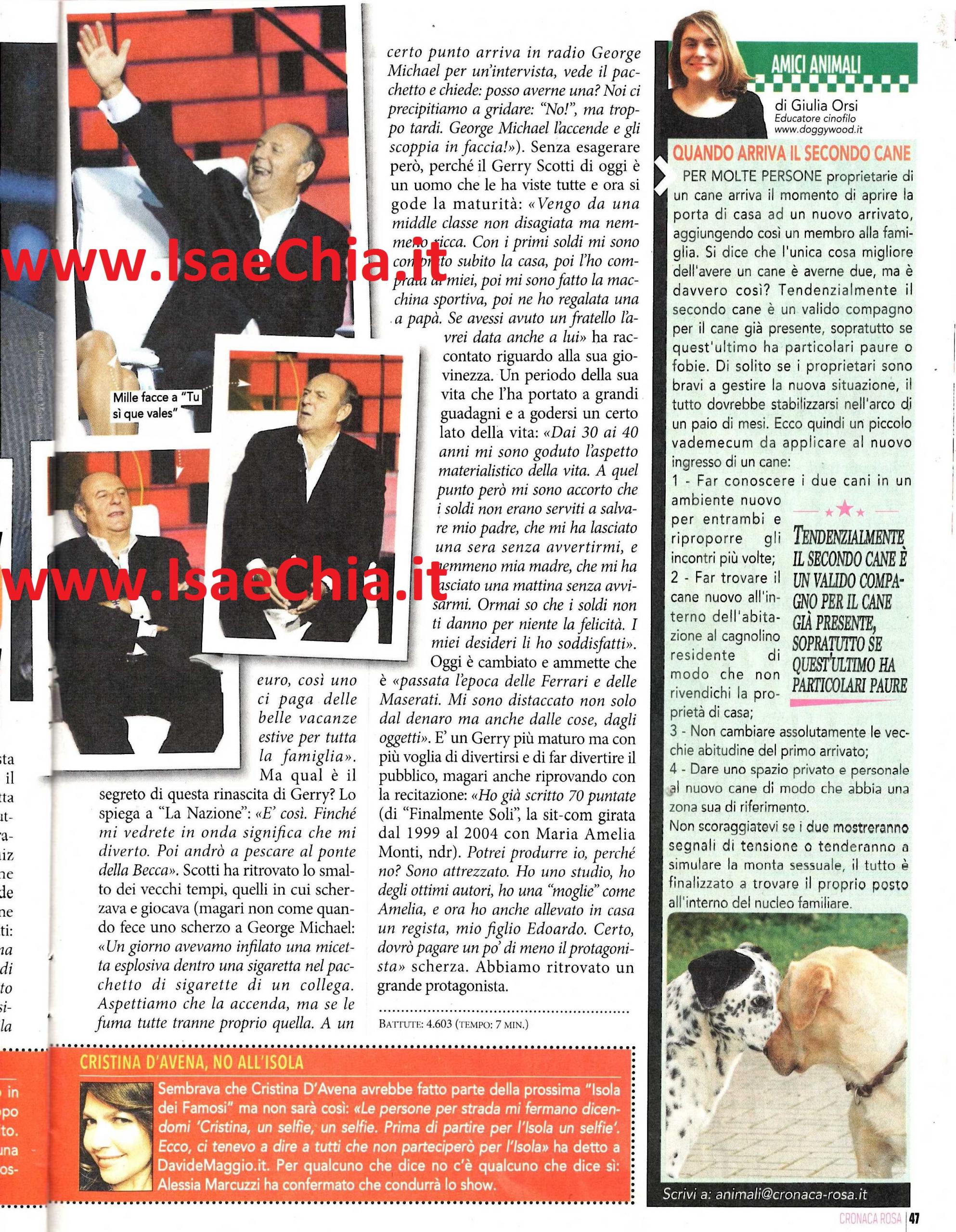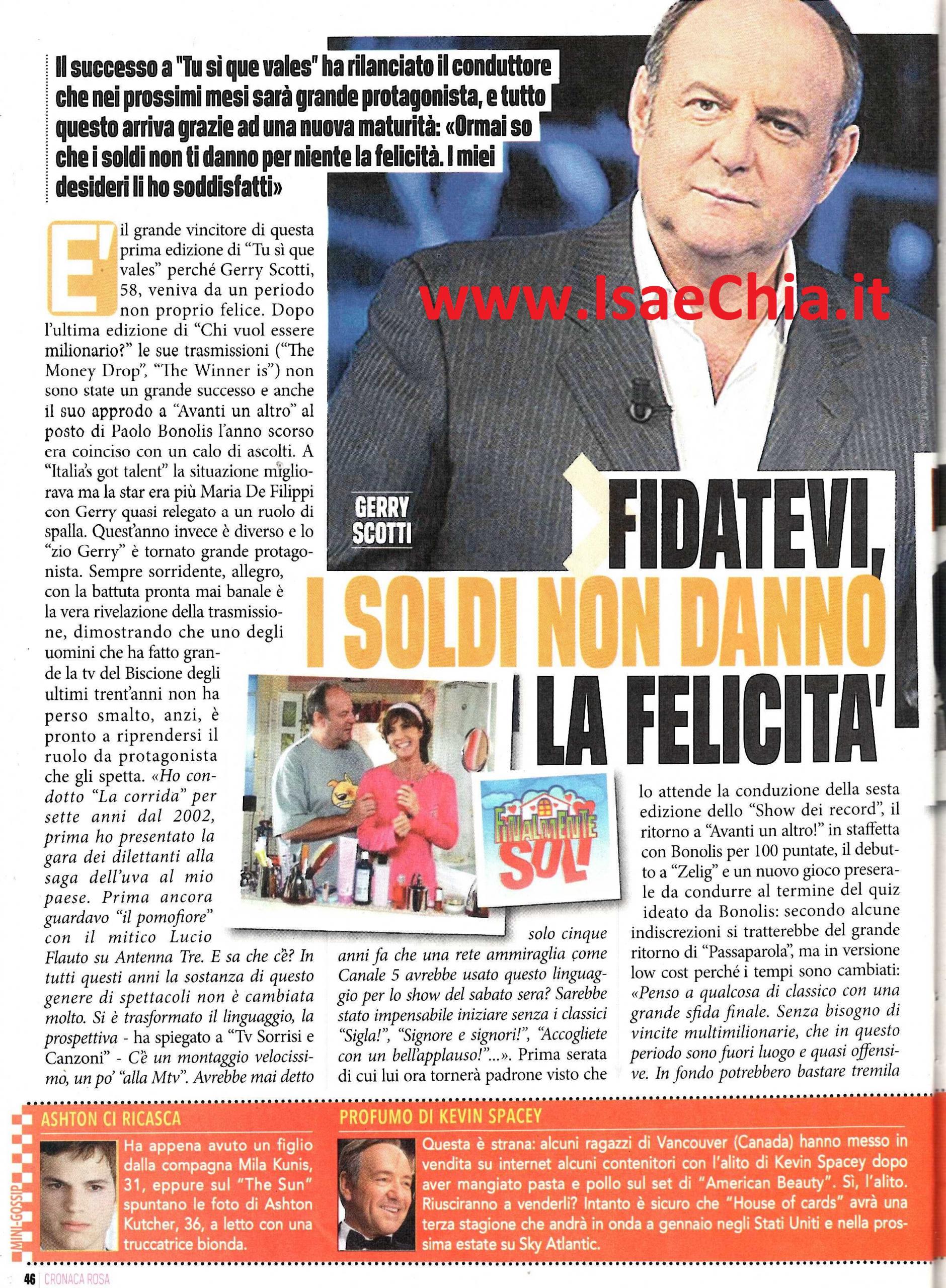 Dopo l’ultima edizione di Chi vuol essere milionario, i suoi nuovi show, The money drop e The winner is, non hanno replicato il successo che lo caratterizzavano in passato. Ma con Tu sì que vales, Gerry Scotti si è rifatto con un successone, e non ha fatto solo da spalla: “Ho condotto La corrida per sette anni, e prima ancora avevo condotto la gara dei dilettanti alla saga del mio paese. E sa che c’è? In tutti questi anni la sostanza di questo genere di programmi non è cambiata molto. Sono cambiati il linguaggio, la prospettiva. C’è un montaggio velocissimo, un po’ alla Mtv. Chi l’avrebbe mai detto solo cinque anni fa che Canale 5 avrebbe adottato questo linguaggio per un programma del sabato sera? Sarebbe stato impensabile uno show senza “Signore e signori, accogliete con un bell’applauso…“. Quando gli si chiede di un possibile ritorno del suo quiz Passaparola, o di qualcosa di simile, risponde: “Penso a qualcosa di classico ma con una maxisfida finale, senza bisogno di vincite multimilionarie, che in questo periodo sono fuori luogo e quasi offensive. In fondo potrebbero bastare 3000 euro, per pagare le vacanze per tutta la famiglia. Finché mi vedrete in onda, vuol dire che mi diverto. Io vengo da una middle class non disagiata ma nemmeno ricca. Con i primi soldi mi sono comprato la mia prima casa, poi l’ho comprata ai miei, poi ho comprato l’auto sportiva. Se avessi avuto un fratello, l’avrei data anche a lui. Dai 30 ai 40 anni mi sono goduto l’aspetto materialistico della vita. Poi mi sono accorto che i soldi non erano serviti a salvare mio padre, e nemmeno mia madre, che mi ha lasciato una mattina senza avvisarmi. Ormai so che i soldi non fanno la felicità: passata l’epoca della Ferrari e della Maserati, mi sono distaccato dal denaro e dalle cose, dagli oggetti“. Infine, rivela che il suo primo amore rimane la recitazione: “Ho scritto 70 puntate di Finalmente soli, la sit-com con Maria Amelia Monti. Potrei produrlo io, perché no? Ho uno studio, ottimi autori, una “moglie” come Amelia. Certo, dovrei pagare un po’ meno il protagonista!”
