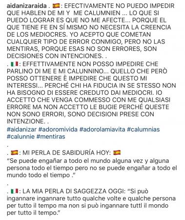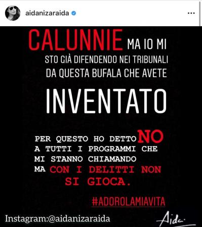 AGGIORNAMENTO – Aida è intervenuta sui social per smentire categoricamente tutte le notizie che stanno circolando sul suo conto in rete nelle ultime ore: “Calunnie, ma io mi sto già difendendo nei tribunali da questa bufala che avete inventato. Per questo ho detto di no a tutti i programmi che mi stanno chiamando. Ma con i delitti non si gioca. Adoro la mia vita. Effettivamente non posso impedire che parlino di me e mi calunnino. Quello che però posso ottenere è impedire che questo mi interessi. Perché chi ha fiducia in se stesso non ha bisogno di essere creduto dai mediocri. Io accetto che venga commesso con me qualsiasi errore, ma non accetto le bugie, perché queste non sono errori, sono decisioni prese con intenzione. Si può ingannare tutti per qualche volta e qualche persona per tutto il tempo, ma non si può ingannare il mondo per tutto il tempo”.