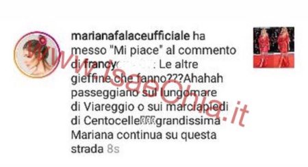 Nelle ultime ore infatti Mariana – dopo aver sfilato sul Red Carpet del Festival Del Cinema di Venezia – ha postato le foto sul suo profilo Instagram ricevendo critiche ma anche complimenti. E’ stato però in particolare un like messo ad un commento di una fan ad aver scatenato le reazioni dei fan di Alessia. Appare chiaro infatti il riferimento alla Prete che da quando è legata all’ex gieffino Matteo Gentili frequenta molto spesso Viareggio, città natale del fidanzato.