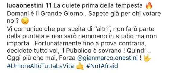 Non è comunque una novità che Luca non sia ospite gradito in questa edizione del reality show dato che – come rivelato da lui stesso in più occasioni sia sui social che negli studi di Mattino 5 (QUI il post a riguardo) – non è mai stato invitato né in puntata né per fare una sorpresa a Gianmarco dentro la Casa, e questo a tal punto che per dimostrare tutto il suo sostegno verso il fratello la scorsa domenica è andato direttamente fuori dalle mura ad urlare tutto il suo amore per lui (QUI il post in cui ve lo abbiamo raccontato).