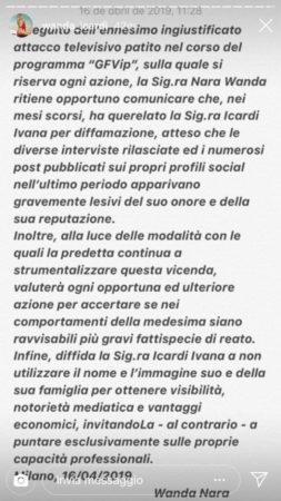 Sentendo quelle ennesime parole nei suoi riguardi, Wanda ha deciso di svelare a mezzo social che già da diversi mesi ha querelato la nuova inquilina di Cinecittà per diffamazione, mentre adesso l’ha anche scelto di diffidarla dal parlare di sé e della sua famiglia per ottenere un riscontro – a detta sua – unicamente mediatico. Questa la nota diffusa nelle sue Instagram Stories: