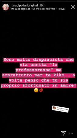 Chi invece pare aver fatto un sorriso beffardo di fronte all’eliminazione di Ambra è stata proprio l’opinionista di Uomini e Donne, che attraverso un’Instagram Story ha ironicamente commentato: ‘Kikò a volte penso che tu sia proprio sfortunato in amore!’.