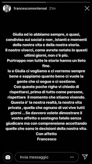 AGGIORNAMENTO – Anche Francesco è intervenuto a mezzo social confermando la separazione da Giulia: