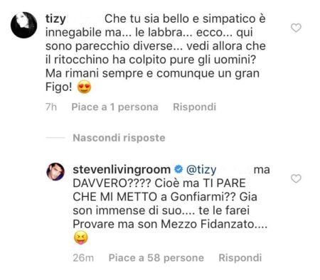 A far sognare tutti i loro followers più appassionati ci ha pensato però Stefano qualche istante fa, che rispondendo ad un commento in cui lo aveva accusato di essersi rifatto le labbra si è lasciato andare ad un’esternazione che ha letteralmente mandato in brodo di giuggiole le sue fan: “Te le farei provare ma sono mezzo fidanzato!”.