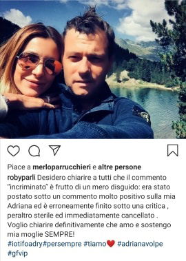 Desidero chiarire a tutti che il commento ‘incriminato’ è frutto di un mero disguido: era stato postato sotto un commento molto positivo sulla mia Adriana ed è erroneamente finito sotto una critica, peraltro sterile ed immediatamente cancellato. Voglio chiarire definitivamente che amo e sostengo mia moglie SEMPRE!