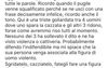 Queste frasi sono battute di comici italiani. Se fossero rivolte ad una donna assumerebbero lo stesso significato pur sapendo in che contesto vengono pronunciate? Io non giustifico in tutto e per tutto Salvo. Spesso dimostra di avere un neurone e di utilizzarlo male. L’oratoria non è certo la sua dote e forse è per questo che è stato scelto tra gli ex dei vari Gf. Anzi, sicuramente. So come si esprime, come scrive sui social. Non è un violento. Mai avuto atteggiamenti violenti. È ignorante nel senso che ignora parecchie cose. Meglio ignorante che uomo violento verso le donne. So che i tempi sono cambiati ma credo che oggi siamo troppo esagerati nel misurare tutte le parole. Ricordo quando il pugile venne squalificato perché se ne uscì con una frase decisamente infelice, ricordo anche il tono. Qui è una triste goliardata tra 4 uomini dove uno spara la cazzata e gli altri 3 ridono, forse come avremmo riso tutti al momento. Nessuno dei 3 ha sollevato il dito e ne ha visto violenza o cattiveria. Probabilmente difendo l’indifendibile ma mi spiace che la sua persona venga associata alla figura di uomo violento. Sgridatelo, ca**iatelo, fategli fare una figura di me**a in diretta ma non fatelo passare per quello che non è. Condannatelo per l’ignoranza.