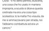 Volvo chiarire questa cosa perché sai, utilizzare in maniera impropria “Buscetta“. Non vorrei che fosse frainteso, solo questo […] Io ritiro questo, l’ho detto perché c’era un momento storico in cui si diceva questa cosa ma l’ho detto quasi in maniera inconsapevole. Noi abbiamo lottato contro la mafia […] noi in sicilia ci muoviamo in prima linea perché ci bloccano un sacco di cose. C’è gente che ha perso la vita, la famiglia, tutto e quindi questo è importante in rispetto di tutto il resto. Pensi di essere in questo micro cosmo e non pensi più a fuori come ha detto Barbara a te quella volta: “Ricordati che quello che tu vivi qua ha un fuori e ha una risonanza“. Io ci ho pensato adesso, oltre alla discussione con Denver, non vorrei… […] domani sarò bella carica. Stamattina mi ero svegliata con una buona cera poi discutere di nuovo con lui e pensare anche a questa cosa… non è il massimo.