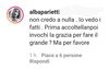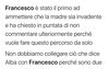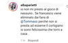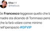 Se Francesco è considerato ciò che non è perché è una persona buona come il pane, é grazie ai dubbi che ha insinuato Tommaso in tutti. Lo ha nominato, lo ha tradito. Fine. Lui sa di poter gestire il suo popolo dei social. Vincerà come sempre succede perché così va il mondo. A me fa molto male vedere ciò che è stato fatto a Francesco perché non lo merita affatto. Ma se così è questo gioco, preferisco torni a casa tra persone che lo amano come merita.