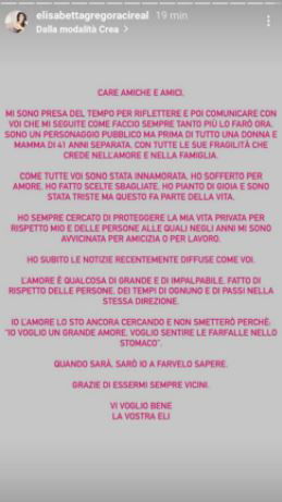 Mi sono presa del tempo per riflettere e poi comunicare con voi che mi seguite come faccio sempre. Sono un personaggio pubblico, ma prima di tutto una mamma e una donna di 41 anni separata, con tutte le sue fragilità che crede nell’amore e nella famiglia. Come tutte voi sono stata innamorata, ho sofferto per amore, ho fatto scelte sbagliate. Ho pianto di gioia e sono stata triste, ma questo fa parte della vita. Ho sempre cercato di proteggere la mia vita privata per rispetto mio e delle persone alle quali negli anni mi sono avvicinata per amicizia o per lavoro. Ho subito le notizie recentemente diffuse come voi. L’amore è qualcosa di grande e di impalpabile, fatto di rispetto delle persone, dei tempi di ognuno e di passi nella stessa direzione. Io l’amore lo sto ancora cercando e non smetterò perché “io voglio un grande amore, voglio sentire le farfalle nello stomaco”. Quando sarà, sarò io a farvelo sapere.