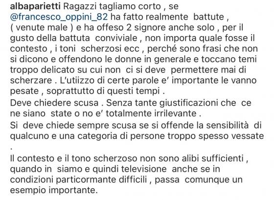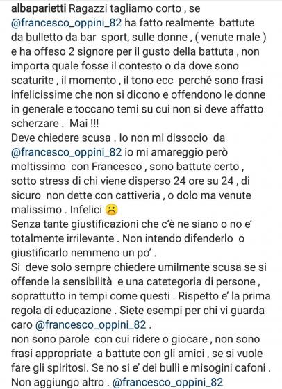 “Se ha fatto realmente battute da bulletto da bar sport, sulle donne (venute male), e ha offeso 2 signore per il gusto della battuta, non importa quale fosse il contesto o da dove sono scaturite, il momento, il tono ecc“, ha scritto Alba, “perché sono frasi infelicissime che non si dicono e offendono le donne in generale e toccano temi su cui non si deve affatto scherzare. Mai! Deve chiedere scusa. Io non mi dissocio da Francesco, io mi amareggio però moltissimo […] Non intendo difenderlo o giustificarlo nemmeno un po’. Si deve solo sempre chiedere umilmente scusa se si offende la sensibilità e una categoria di persone, soprattutto in tempi come questi. Rispetto è la prima regola di educazione. Siete esempi per chi vi guarda, caro Francesco, non sono parole con cui ridere o giocare, non sono frasi appropriate a battute con amici, se si vuole fare gli spiritosi. Se no, si è dei bulli e misogini cafoni. Non aggiungo altro“.