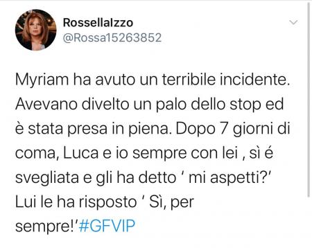 Quest’oggi, proprio la madre, ha voluto svelare qualcosa in più della vita della figlia, che in questi giorni si è raccontata al Gf anche attraverso la famosa linea della vita durante la quale ha ripercorso tutte le tappe fondamentali della sua esistenza, parlando anche di un brutto incidente che l’aveva coinvolta anni fa. A proposito di quel momento così terribile, la mamma Rossella ha, però, svelato un toccante retroscena che riguarda anche Luca Argentero, l’ex marito di Myriam. “Myriam ha avuto un terribile incidente” ha esordito la Izzo su Twitter, che poi ha proseguito: “Avevano divelto un palo dello stop ed è stata presa in pieno. Dopo 7 giorni di coma, Luca e io sempre con lei , si é svegliata e gli ha detto ‘ Mi aspetti?’ Lui le ha risposto ‘Sì, per sempre!'”.