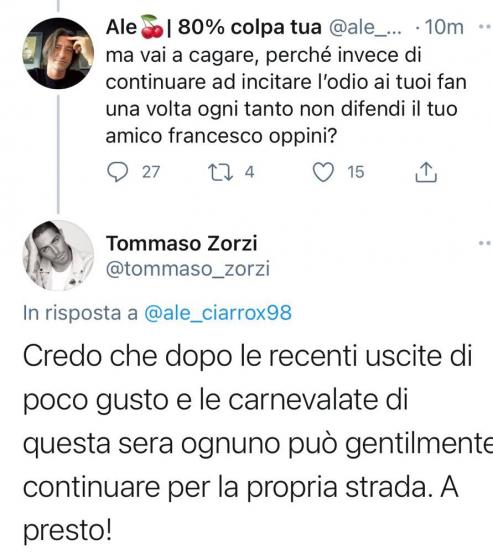 Zorzi, parlando di recenti uscite di poco gusto, si riferisce chiaramente a un altro amico proprio di Oppini che, nel corso di una diretta Instagram, ha usato la F-word, colpendo la sensibilità di Tommaso e non solo. Proprio Francesco, l’indomani, aveva inquadrato l’amico in una storia per consentirgli di scusarsi per l’accaduto. E tutto sembrava essersi concluso lì.