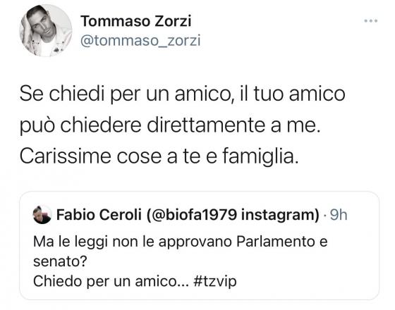 Ma veniamo a noi. Un amico di Francesco qualche ora fa, utilizzando proprio l’hastag di Tommaso (#TzVip), ha pubblicato il seguente Tweet. “Ma le leggi non le approvano in Parlamento e Senato? Chiedo per un amico!“. Non è ben chiaro da cosa sia partito tutto. Ciò che è certo, invece, è che è stata immediata la risposta di Zorzi, con tanto di frecciatina piccata proprio a Oppini:”Se chiedi per un amico, il tuo amico può chiedere direttamente a me. Carissime cose a te e famiglia“.