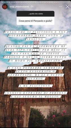 Luigi Mastroianni, che conosce sia Pierpaolo che Giulia, si è detto infatti felice di questa conoscenza e ha invitato entrambi a viversi al meglio questa conoscenza senza doversi giustificare con nessuno: “Si piacciono e non dovrebbero dar conto a nessuno. Quando fai un’esperienza di quel tipo, chiuso per mesi in una Casa con le stesse persone, è ovvio vivere tutto in modo più amplificato. A casa potrebbe sembrare tutto esagerato o affrettato, ma lì è tutto diverso. A me piacciono. Conosco entrambi di persona e auguro loro il meglio”.