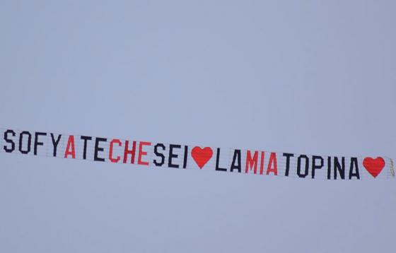 Sui cieli di Cinecittà, infatti, ha volato un aereo con una romantica dedica proprio per l’ex tronista: “Sophie, a te che sei la mia topina“