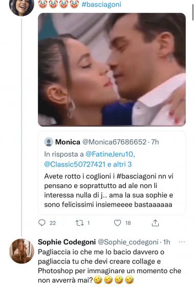 Sta creando un bel po’ di fermento social la risposta piccata che Sophie Codegoni ha dato a una fan su Twitter. La ragazza in questione ha pubblicato un collage su Alessandro Basciano e la principessa etiope che ha fatto esplodere la Vippona. Nella foto si vedono i due quasi sfiorarsi le labbra per un bacio con le emoticon di un pagliaccio e l’hashtag #basciagoni. Un gesto di dubbio gusto a cui ha voluto immediatamente replicare l’influencer: