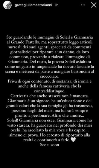Greta ha quindi difeso il suo uomo e si è scagliata nuovamente contro Soleil che a detta sua, in puntata, ha mostrato cattiveria nei confronti del gieffino.