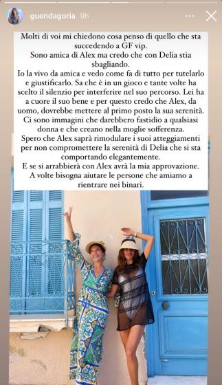 Molti di voi mi chiedono cosa ne penso di quello che sta succedendo al Gf Vip 6. Sono amica di Alex ma credo che con Delia stia sbagliando. Io la vivo da amica e vedo come fa di tutto per tutelarlo e giustificarlo. Sa che è in un gioco e tante volte ha scelto il silenzio per non interferire nel suo percorso. Lei ha a cuore il suo bene e per questo credo che Alex, da uomo, dovrebbe mettere al primo posto la sua serenità.