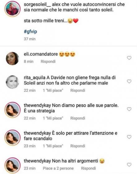 A dire la sua su Belli è stata Wendy Kay, la mamma della gieffina, sotto un post su Instagram condiviso da una fanpage della figlia in cui c’era scritto: “Alex che vuole autoconvincersi che sia normale che le manchi così tanto Soleil. Sta sotto mille treni“.