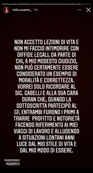 Non accetto lezioni di vita e non mi faccio intimorire con diffide legali, da parte di chi, a mio modesto giudizio, non può certamente essere considerato un esempio di moralità e correttezza. Vorrei solo ricordare al Sig. Gabelli (Alessandro Gabelli è il vero nome dell’attore) e alla sua cara Duran che, quando la sottoscritta partecipò al Gf, entrambi furono i primi a trarre profitto e notorietà facendo riferimento ai miei viaggi di lavoro e alludendo a situazioni lontani anni luce dal mio stile di vita e dal mio modo di essere.