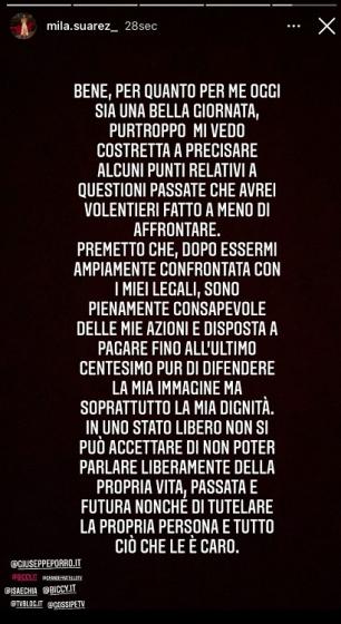 Mila Suarez è stata diffidata dall’ex compagno Alex Belli, lo ha rivelato lo stesso attore nella Casa del Grande fratello Vip 6. Ieri sera, su Instagram, la Suarez ha voluto precisare la sua posizione. Ecco cosa ha scritto nelle storie: