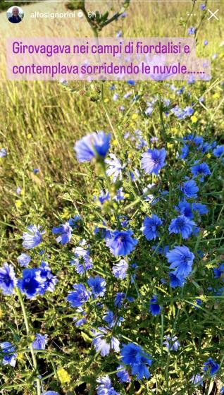 È di poche ore fa un nuovo indizio che potrebbe portare a una doppia interpretazione. Nella storia pubblicata dal padrone di casa del Gf Vip 7, vediamo un campo di fiordalisi e la frase: “girovagava nel campi di fiordalisi e contemplava sorridendo le nuvole”.