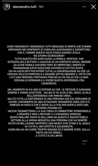 Voleva trasmettergli la sua forza di combattere spingendolo a reagire e non a restare lì a piangersi addosso. Sento parlare tanto di bullismo, ma questo è inaccettabile. Gettare alla gogna mediatica una persona che ha sempre avuto un bellissimo rapporto con Marco (che stimo e al quale va tutto il mio affetto e solidarietà). Carolina ha un cuore troppo grande ed è sempre stata dalla parte dei più deboli. A tutto c’è un limite.