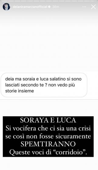 Stando ai follower più attenti, Luca Salatino e Soraia non pubblicano storie di coppia da diverso tempo. Molti utenti, allarmati, si sono messi in contatto con Deianira Marzano, punto di riferimento per gli amanti del gossip. L’influencer ha repostato uno dei messaggi ricevuti in direct, scrivendo: