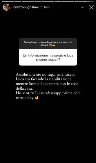 Assolutamente no. Smentisco. Luca sta facendo la riabilitazione, mentre Soraia è occupata con le cose di casa. Ho sentito Luca su whattsapp prima ed è tutto okay.